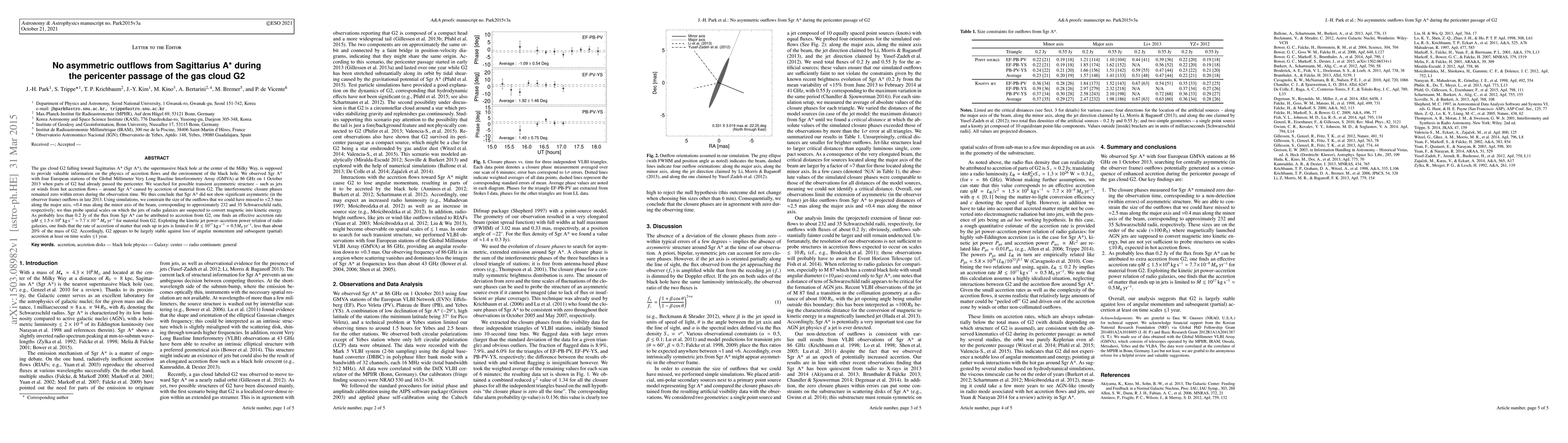 The study observed Sagittarius A* during the pericenter passage of the gas cloud G2, finding no significant asymmetric outflows, constraining the potential outflow size to small scales. The effective accretion rate from G2 is estimated to be less than 7.7 × 10^-9 Mearth/yr, indicating G2 is largely stable against rapid accretion.