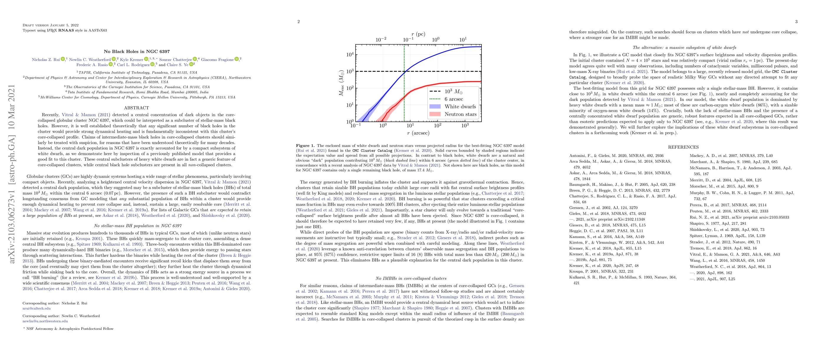 Recently, \citet{vitral2021does} detected a central concentration of dark objects in the core-collapsed globular cluster NGC 6397, which could be interpreted as a subcluster of stellar-mass black holes. However, it is well established theoretically that any significant number of black holes in the cluster would provide strong dynamical heating and is fundamentally inconsistent with this cluster's core-collapsed profile. Claims of intermediate-mass black holes in core-collapsed clusters should similarly be treated with suspicion, for reasons that have been understood theoretically for many decades. Instead, the central dark population in NGC 6397 is exactly accounted for by a compact subsystem of white dwarfs, as we demonstrate here by inspection of a previously published model that provides a good fit to this cluster. These central subclusters of heavy white dwarfs are in fact a generic feature of core-collapsed clusters, while central black hole subclusters are present in all {\em non\/}-collapsed clusters.