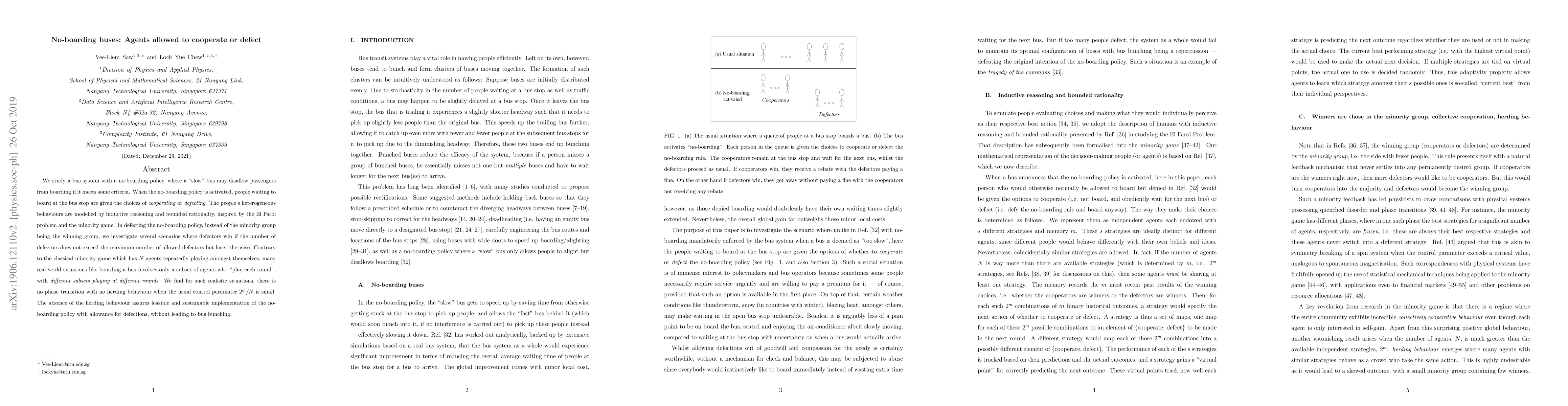 We study a bus system with a no-boarding policy, where a "slow" bus may disallow passengers from boarding if it meets some criteria. When the no-boarding policy is activated, people waiting to board at the bus stop are given the choices of \emph{cooperating} or \emph{defecting}. The people's heterogeneous behaviours are modelled by inductive reasoning and bounded rationality, inspired by the El Farol problem and the minority game. In defecting the no-boarding policy, instead of the minority group being the winning group, we investigate several scenarios where defectors win if the number of defectors does not exceed the maximum number of allowed defectors but lose otherwise. Contrary to the classical minority game which has $N$ agents repeatedly playing amongst themselves, many real-world situations like boarding a bus involves only a subset of agents who "play each round", with \emph{different subsets playing at different rounds}. We find for such realistic situations, there is no phase transition with no herding behaviour when the usual control paramater $2^m/N$ is small. The absence of the herding behaviour assures feasible and sustainable implementation of the no-boarding policy with allowance for defections, without leading to bus bunching.
