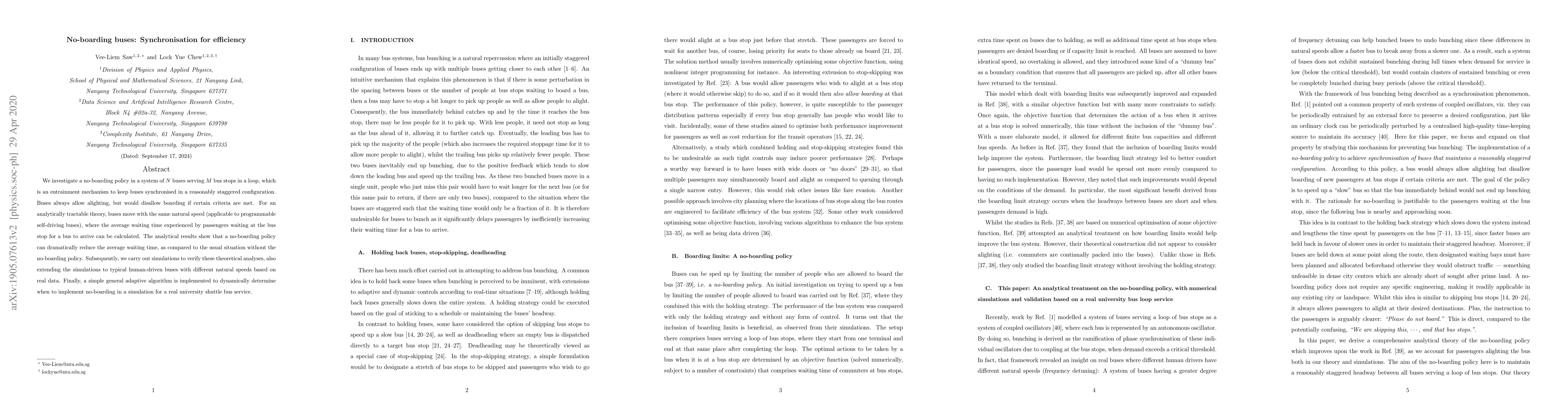 We investigate a no-boarding policy in a system of $N$ buses serving $M$ bus stops in a loop, which is an entrainment mechanism to keep buses synchronised in a reasonably staggered configuration. Buses always allow alighting, but would disallow boarding if certain criteria are met. For an analytically tractable theory, buses move with the same natural speed (applicable to programmable self-driving buses), where the average waiting time experienced by passengers waiting at the bus stop for a bus to arrive can be calculated. The analytical results show that a no-boarding policy can dramatically reduce the average waiting time, as compared to the usual situation without the no-boarding policy. Subsequently, we carry out simulations to verify these theoretical analyses, also extending the simulations to typical human-driven buses with different natural speeds based on real data. Finally, a simple general adaptive algorithm is implemented to dynamically determine when to implement no-boarding in a simulation for a real university shuttle bus service.