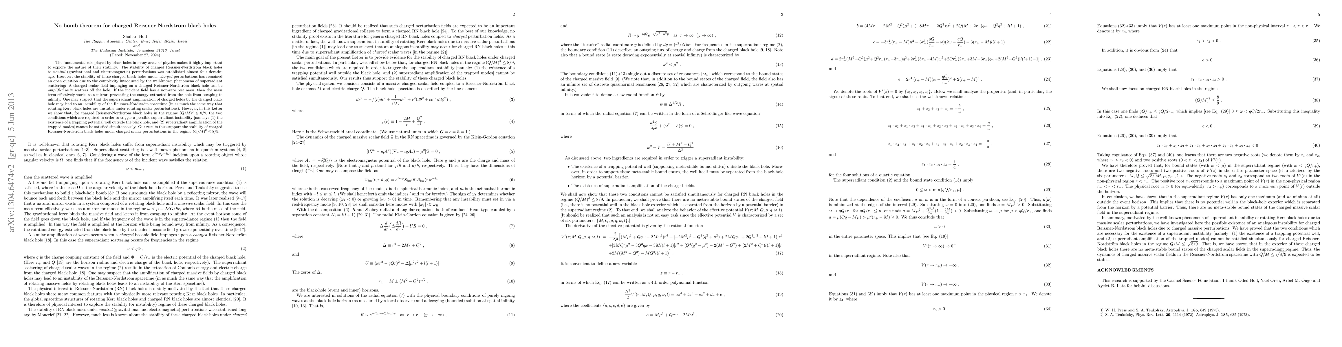 This paper demonstrates that charged Reissner-Nordström black holes with a charge-to-mass ratio squared less than or equal to 8/9 remain stable under charged scalar perturbations, refuting the possibility of superradiant instabilities. The authors prove that the conditions for superradiant amplification cannot be met simultaneously, ensuring the stability of such black holes.