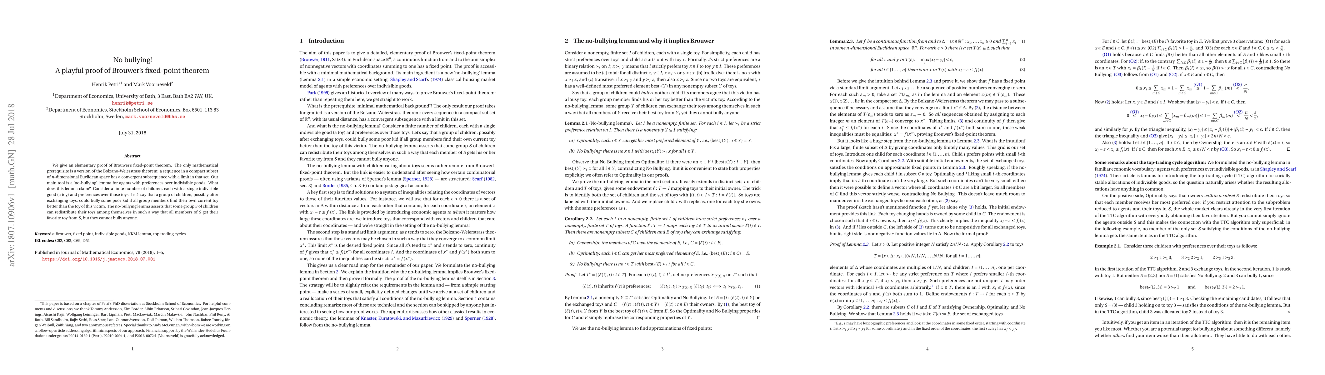 We give an elementary proof of Brouwer's fixed-point theorem. The only mathematical prerequisite is a version of the Bolzano-Weierstrass theorem: a sequence in a compact subset of $n$-dimensional Euclidean space has a convergent subsequence with a limit in that set. Our main tool is a `no-bullying' lemma for agents with preferences over indivisible goods. What does this lemma claim? Consider a finite number of children, each with a single indivisible good (a toy) and preferences over those toys. Let's say that a group of children, possibly after exchanging toys, could bully some poor kid if all group members find their own current toy better than the toy of this victim. The no-bullying lemma asserts that some group $S$ of children can redistribute their toys among themselves in such a way that all members of $S$ get their favorite toy from $S$, but they cannot bully anyone.