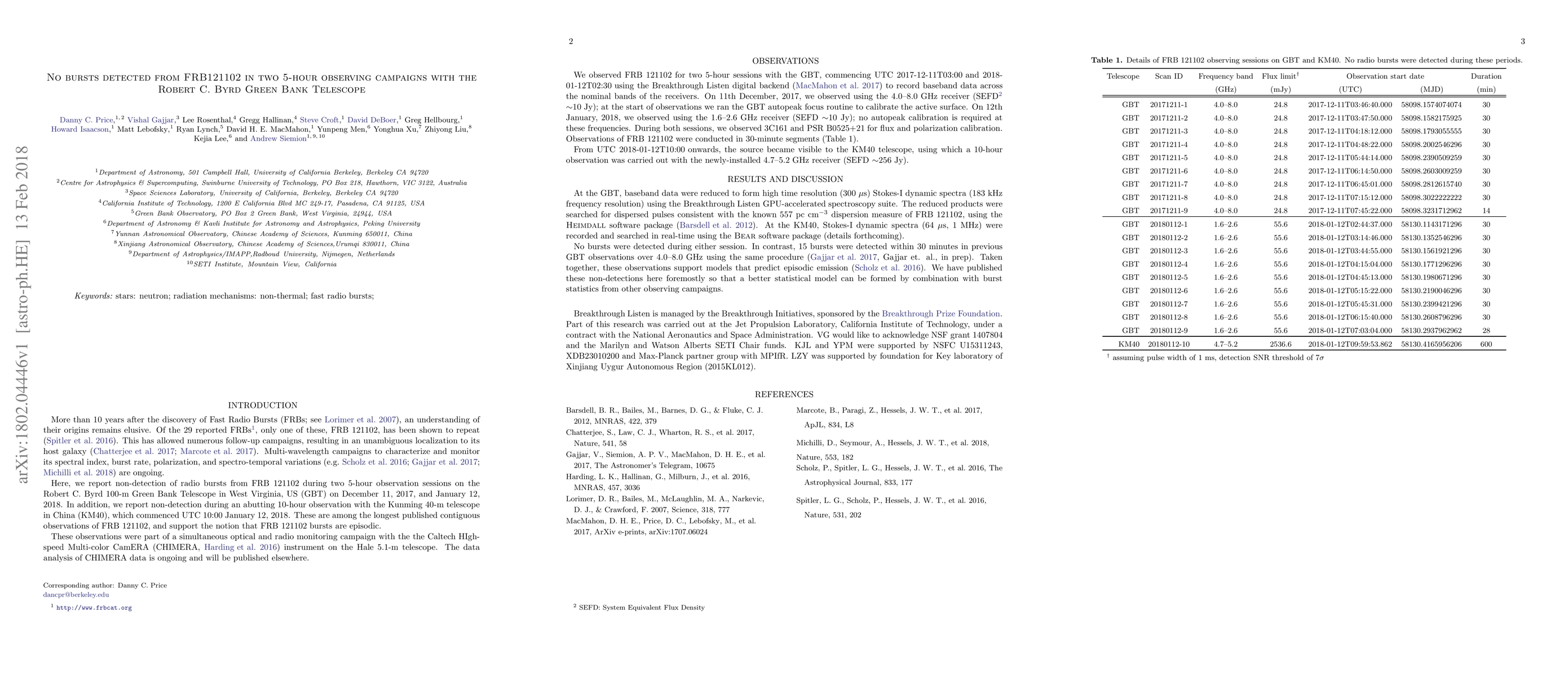 Here, we report non-detection of radio bursts from Fast Radio Burst FRB 121102 during two 5-hour observation sessions on the Robert C. Byrd 100-m Green Bank Telescope in West Virginia, USA, on December 11, 2017, and January 12, 2018. In addition, we report non-detection during an abutting 10-hour observation with the Kunming 40-m telescope in China, which commenced UTC 10:00 January 12, 2018. These are among the longest published contiguous observations of FRB 121102, and support the notion that FRB 121102 bursts are episodic. These observations were part of a simultaneous optical and radio monitoring campaign with the the Caltech HIgh- speed Multi-color CamERA (CHIMERA) instrument on the Hale 5.1-m telescope.