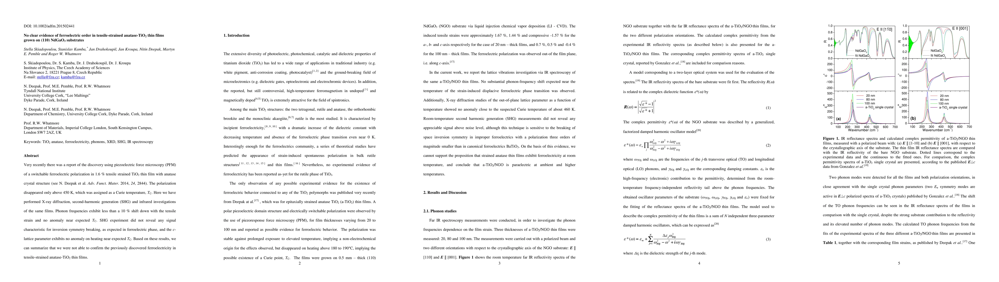 Very recently there was a report of the discovery using piezoelectric force microscopy (PFM) of a switchable ferroelectric polarization in 1.6 % tensile strained TiO2 thin film with anatase crystal structure (see N. Deepak et al. Adv. Funct. Mater. 2014, 24, 2844). The polarization disappeared only above 450 K, which was assigned as a Curie temperature, Tc. Here we have performed X-ray diffraction, second-harmonic generation (SHG) and infrared investigations of the same films. Phonon frequencies exhibit less than a 10 % shift down with the tensile strain and no anomaly near expected TC. SHG experiment did not reveal any signal characteristic for inversion symmetry breaking, as expected in ferroelectric phase, and the c-lattice parameter exhibits no anomaly on heating near expected TC. Based on these results, we can summarize that we were not able to confirm the previously discovered ferroelectricity in tensile-strained anatase-TiO2 thin films.