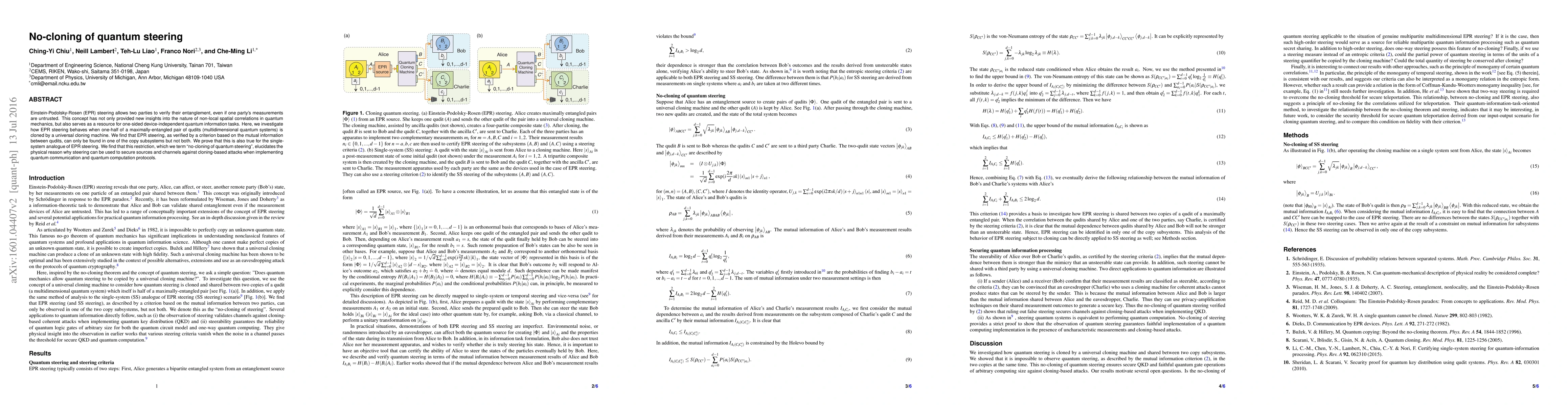 This paper investigates the behavior of Einstein-Podolsky-Rosen (EPR) steering when one-half of a maximally-entangled pair is cloned, finding that EPR steering cannot be cloned and thus termed "no-cloning of quantum steering." This discovery highlights why EPR steering can secure quantum communication against cloning-based attacks.