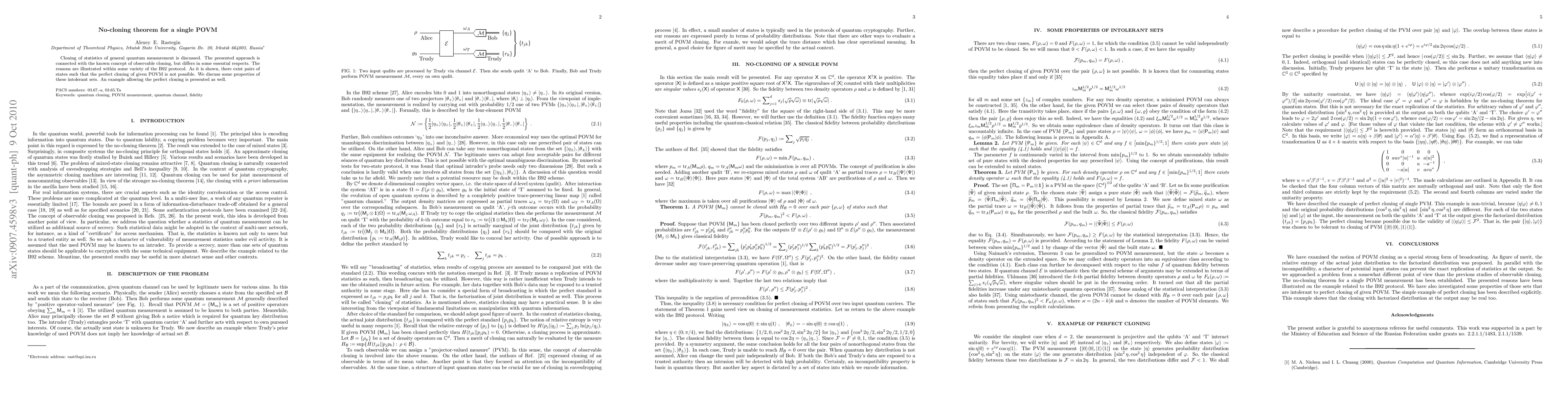Cloning of statistics of general quantum measurement is discussed. The presented approach is connected with the known concept of observable cloning, but differs in some essential respects. The reasons are illustrated within some variety of B92 protocol. As it is shown, there exist pairs of states such that the perfect cloning of given POVM is not possible. We discuss some properties of these intolerant sets. An example allowing the perfect cloning is presented as well.