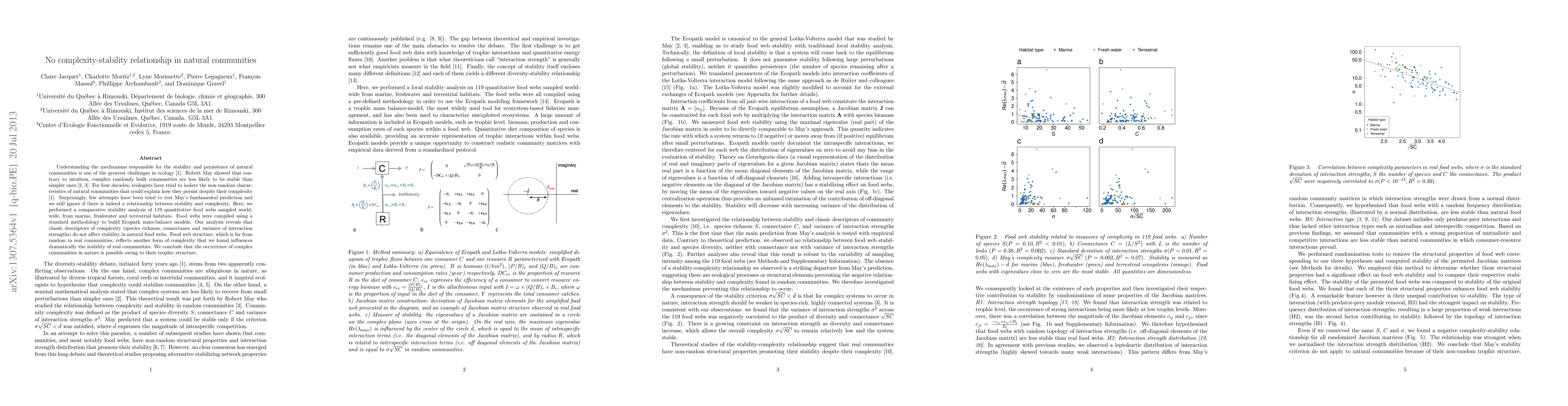 We performed a stability analysis of 119 quantitative food webs which were compiled using a standard methodology to build Ecopath mass-balance models. Our analysis reveals that classic descriptors of complexity do not affect stability in natural food webs. Food web structure, which is non-random in real communities, reflects another form of complexity that we found influences dramatically the stability of real communities. We conclude that the occurrence of complex communities in nature is possible owing to their trophic structure.