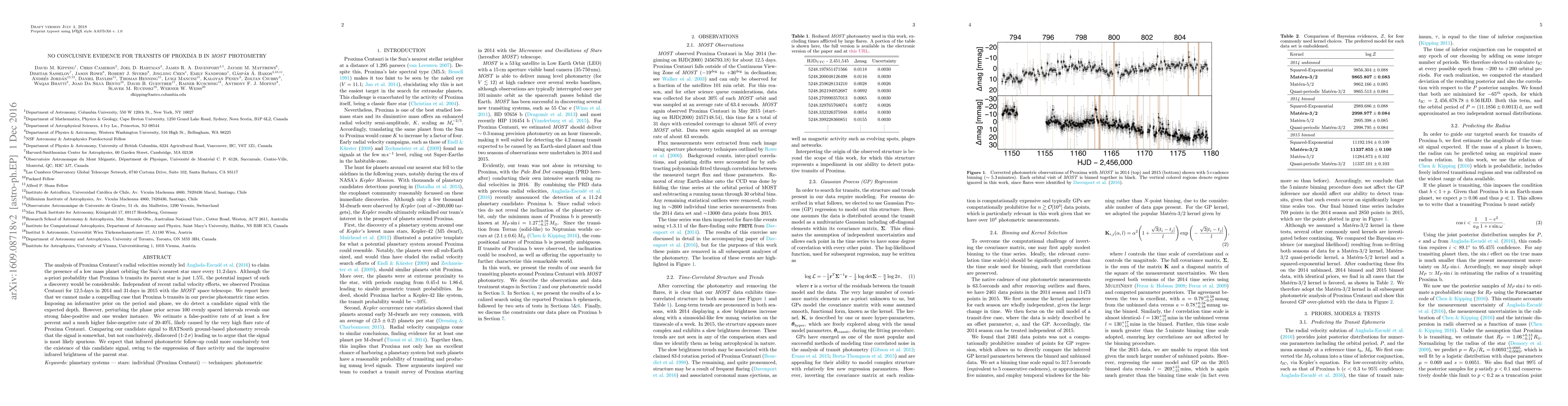 This study analyzed MOST space telescope photometry of Proxima Centauri to search for transits of Proxima b, a planet claimed by Anglada-Escudé et al. (2016). Despite detecting a candidate signal, the analysis suggests a high false-positive rate and concludes that the evidence for Proxima b transits is inconclusive, likely due to the star's high flare activity.