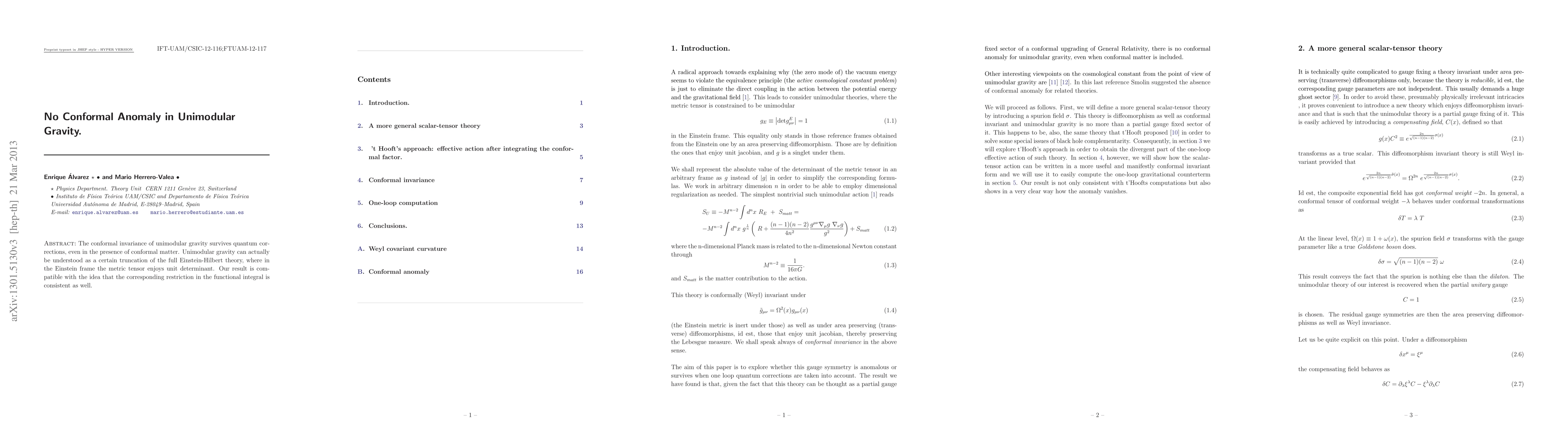 Summary: Unimodular gravity maintains conformal invariance under quantum corrections, even with conformal matter, and can be viewed as a simplified version of Einstein-Hilbert theory with a unit determinant metric tensor, ensuring consistency in the functional integral.