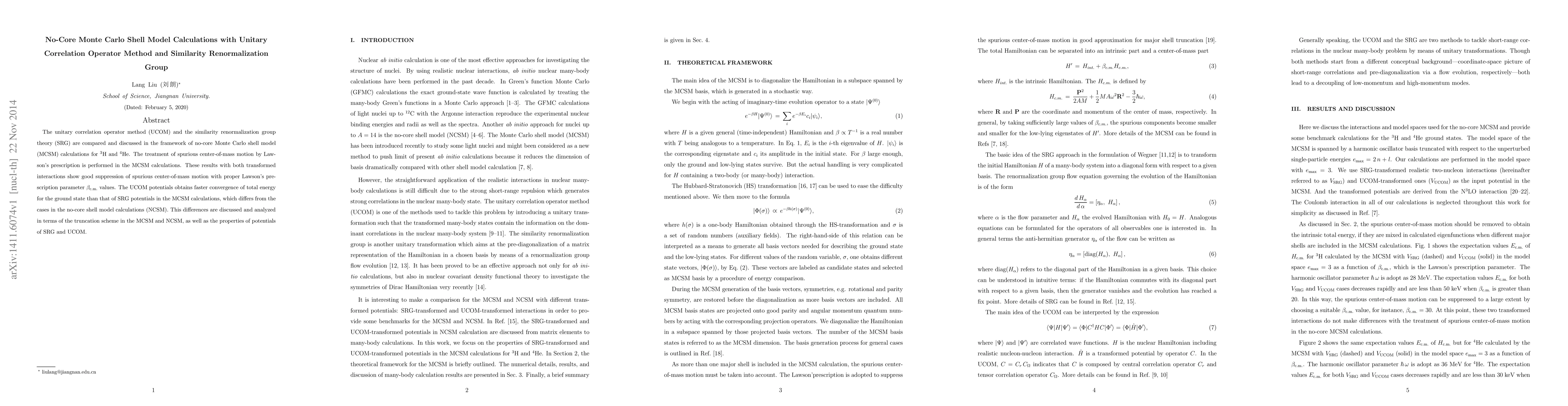 This paper compares the unitary correlation operator method (UCOM) and similarity renormalization group (SRG) within no-core Monte Carlo shell model (MCSM) calculations for $^{3}$H and $^{4}$He. It finds that both methods effectively suppress spurious center-of-mass motion, but UCOM shows faster convergence for ground state energy compared to SRG, contrasting with results from no-core shell model calculations.