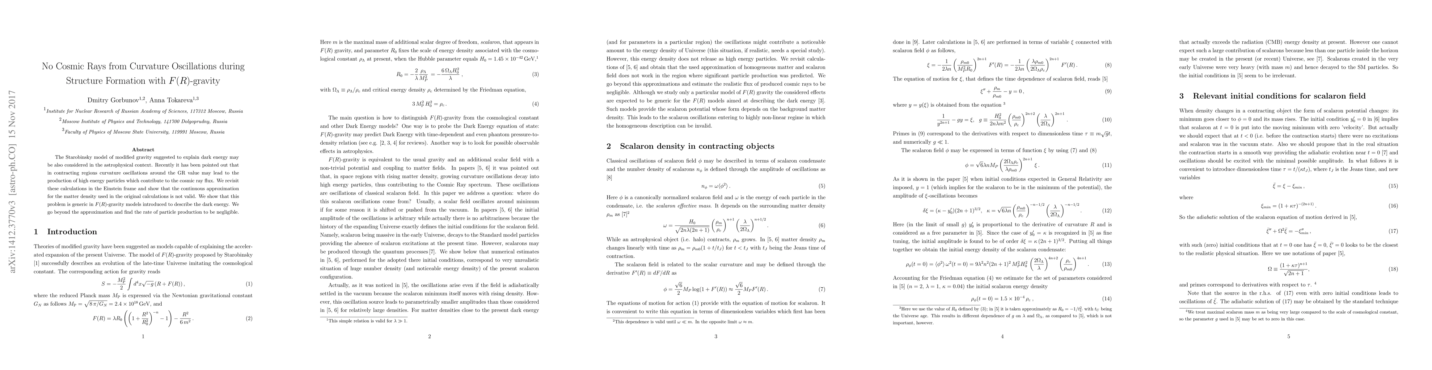 The Starobinsky model of modified gravity suggested to explain dark energy may be also considered in the astrophysical context. Recently it has been pointed out that in contracting regions curvature oscillations around the GR value may lead to the production of high energy particles which contribute to the cosmic ray flux. We revisit these calculations in the Einstein frame and show that the continuous approximation for the matter density used in the original calculations is not valid. We show that this problem is generic in $F(R)$-gravity models introduced to describe the dark energy. We go beyond the approximation and find the rate of particle production to be negligible.