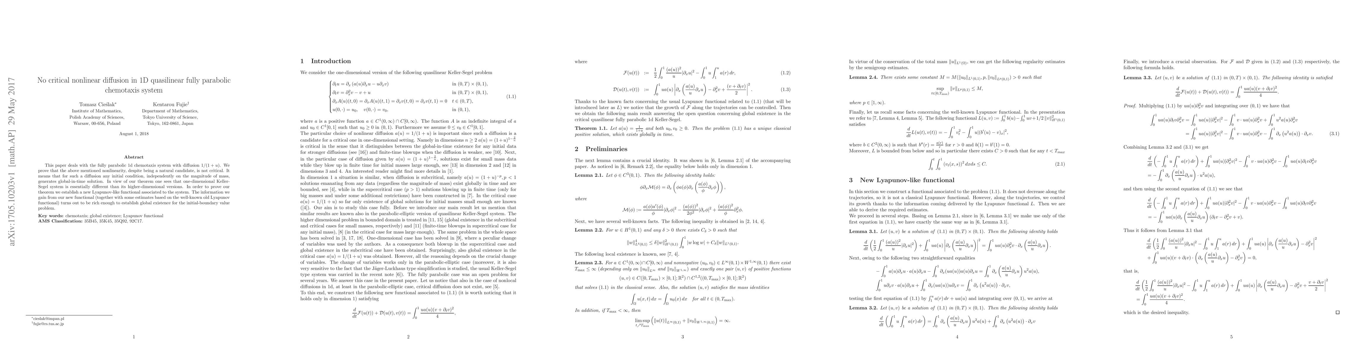 This research proves that a specific type of nonlinear diffusion in a one-dimensional chemotaxis system does not lead to critical behavior, ensuring global-in-time solutions regardless of initial mass. The study introduces a new Lyapunov-like functional to establish this, contrasting the one-dimensional Keller-Segel system with its higher-dimensional counterparts.