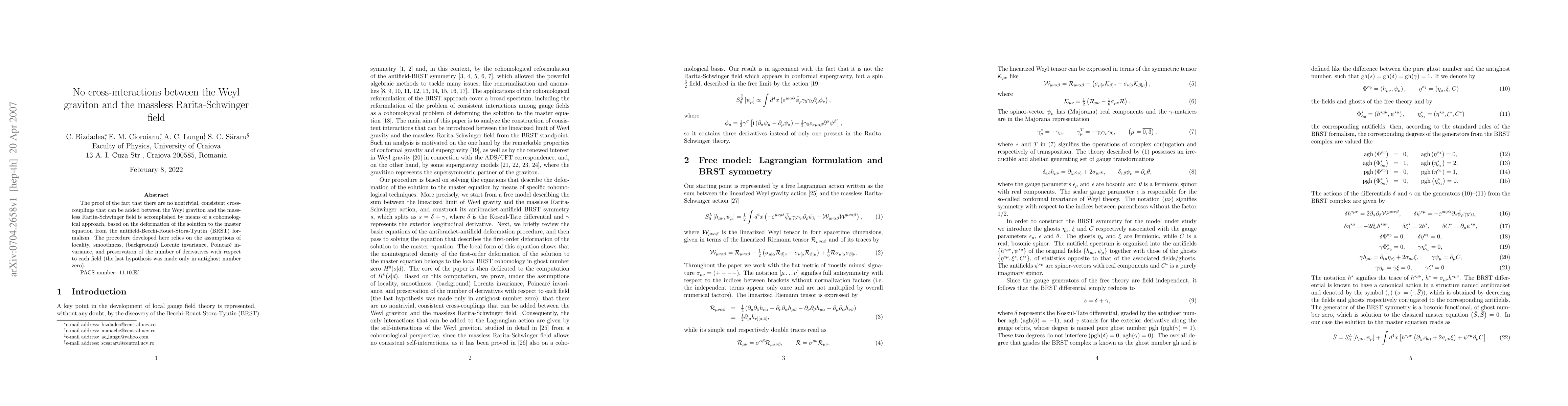 The proof of the fact that there are no nontrivial, consistent cross-couplings that can be added between the Weyl graviton and the massless Rarita-Schwinger field is accomplished by means of a cohomological approach, based on the deformation of the solution to the master equation from the antifield-Becchi-Rouet-Stora-Tyutin (BRST) formalism. The procedure developed here relies on the assumptions of locality, smoothness, (background) Lorentz invariance, Poincare invariance, and preservation of the number of derivatives with respect to each field (the last hypothesis was made only in antighost number zero).