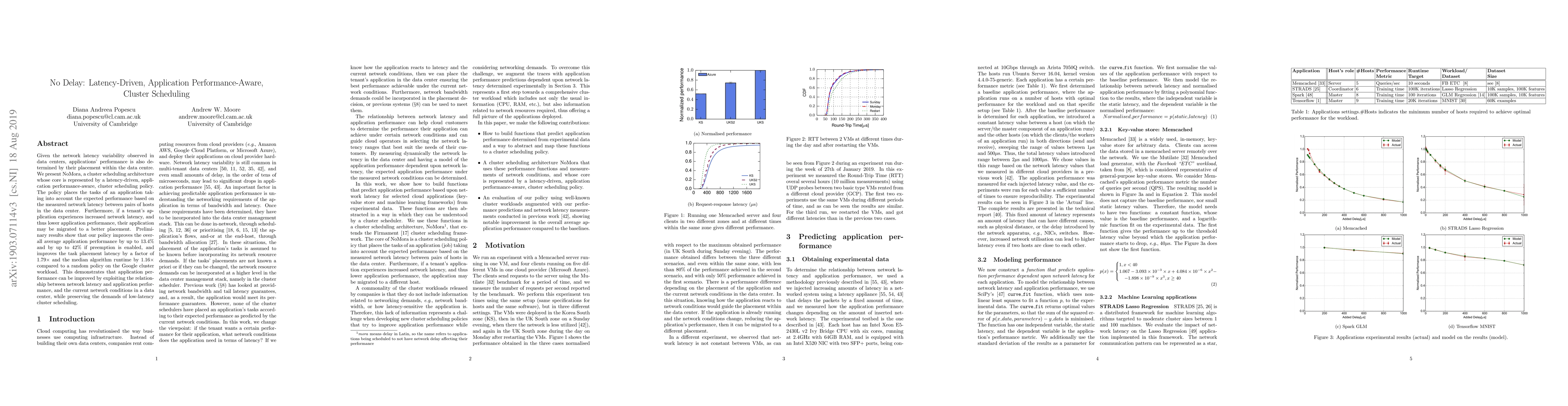 Given the network latency variability observed in data centers, applications' performance is also determined by their placement within the data centre. We present NoMora, a cluster scheduling architecture whose core is represented by a latency-driven, application performance-aware, cluster scheduling policy. The policy places the tasks of an application taking into account the expected performance based on the measured network latency between pairs of hosts in the data center. Furthermore, if a tenant's application experiences increased network latency, and thus lower application performance, their application may be migrated to a better placement. Preliminary results show that our policy improves the overall average application performance by up to 13.4% and by up to 42% if preemption is enabled, and improves the task placement latency by a factor of 1.79x and the median algorithm runtime by 1.16x compared to a random policy on the Google cluster workload. This demonstrates that application performance can be improved by exploiting the relationship between network latency and application performance, and the current network conditions in a data center, while preserving the demands of low-latency cluster scheduling.