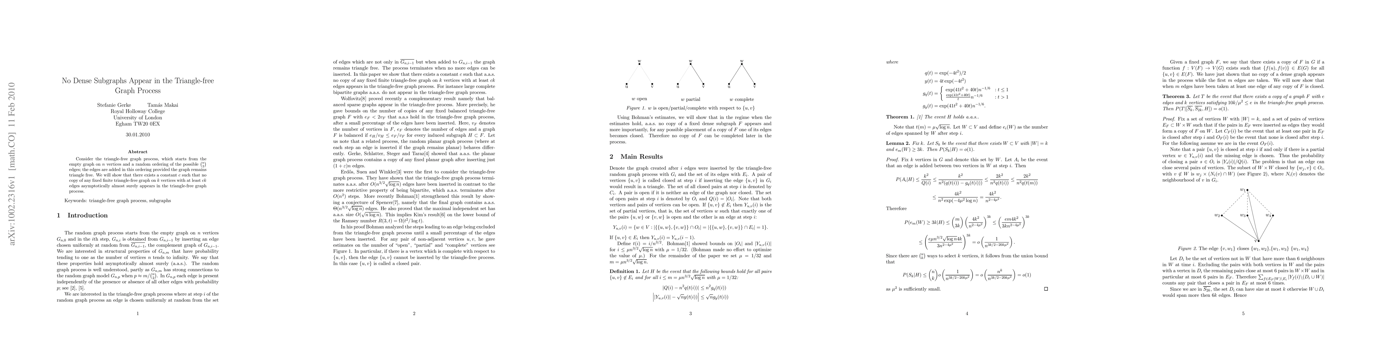 This paper demonstrates that in the triangle-free graph process, no dense subgraphs (triangle-free graphs with a significant number of edges) appear asymptotically almost surely. Specifically, it proves that no fixed triangle-free graph with at least $ck$ edges, for some constant $c$, will appear as a subgraph.