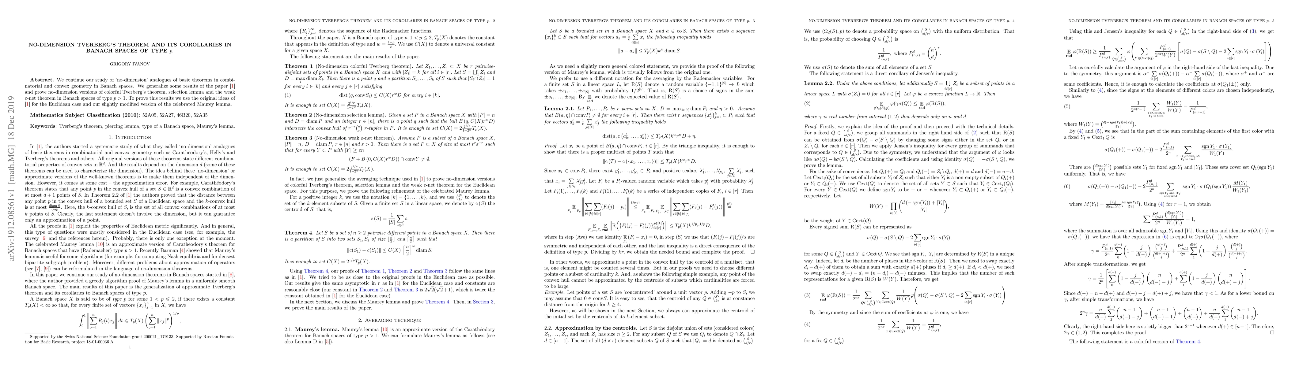 The paper generalizes results from combinatorial geometry to Banach spaces of type $p > 1$, proving 'no-dimension' versions of colorful Tverberg's theorem, selection lemma, and the weak $ ext{ε}$-net theorem.
