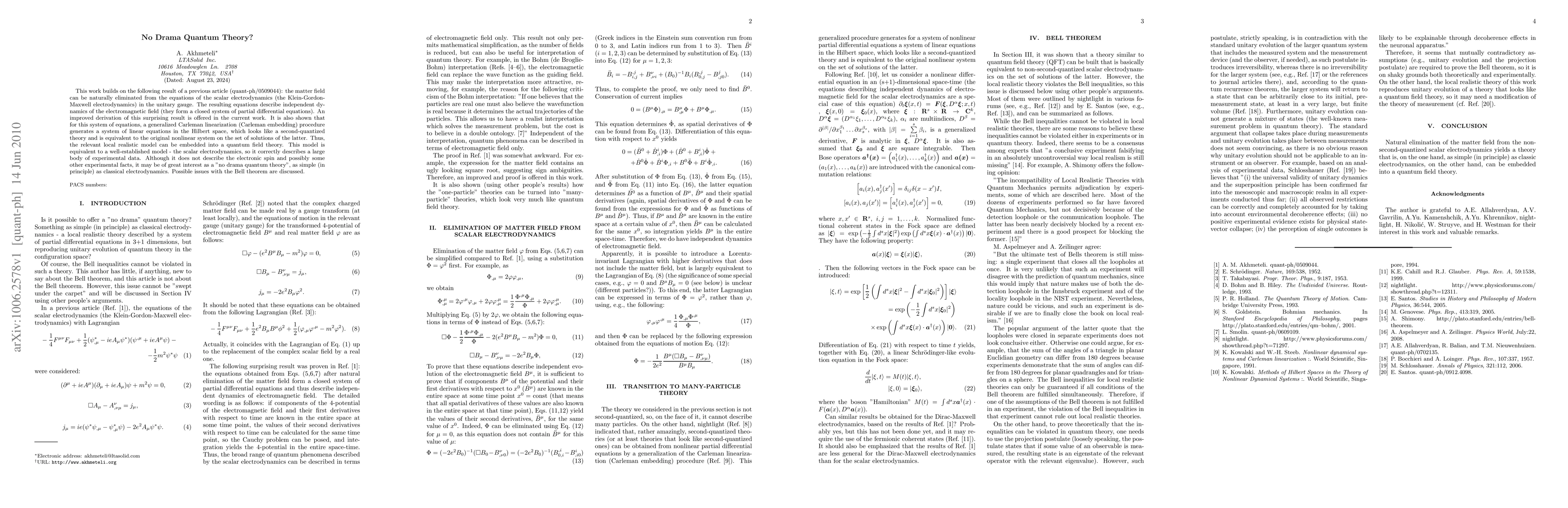 This work builds on the following result of a previous article (quant-ph/0509044): the matter field can be naturally eliminated from the equations of the scalar electrodynamics (the Klein-Gordon-Maxwell electrodynamics) in the unitary gauge. The resulting equations describe independent dynamics of the electromagnetic field (they form a closed system of partial differential equations). An improved derivation of this surprising result is offered in the current work. It is also shown that for this system of equations, a generalized Carleman linearization (Carleman embedding) procedure generates a system of linear equations in the Hilbert space, which looks like a second-quantized theory and is equivalent to the original nonlinear system on the set of solutions of the latter. Thus, the relevant local realistic model can be embedded into a quantum field theory. This model is equivalent to a well-established model - the scalar electrodynamics, so it correctly describes a large body of experimental data. Although it does not describe the electronic spin and possibly some other experimental facts, it may be of great interest as a "no drama quantum theory", as simple (in principle) as classical electrodynamics. Possible issues with the Bell theorem are discussed.