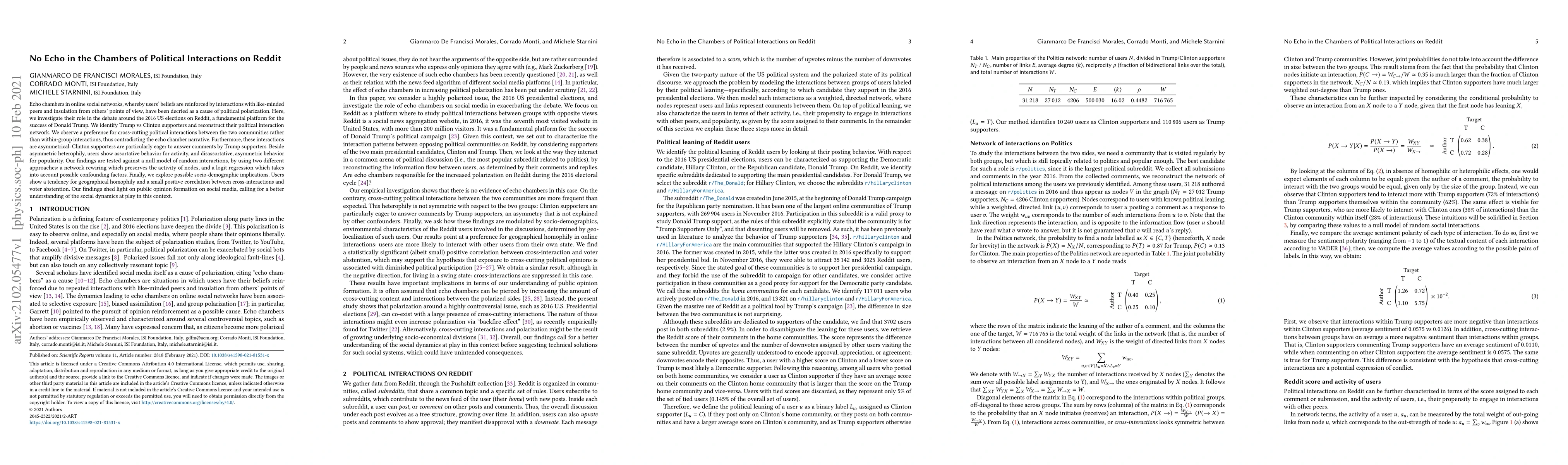 This study finds that during the 2016 US elections on Reddit, Trump and Clinton supporters exhibited more cross-cutting political interactions than within-group interactions, challenging the echo chamber theory. The research also highlights asymmetrical engagement, with Clinton supporters more active in responding to Trump supporters' comments.