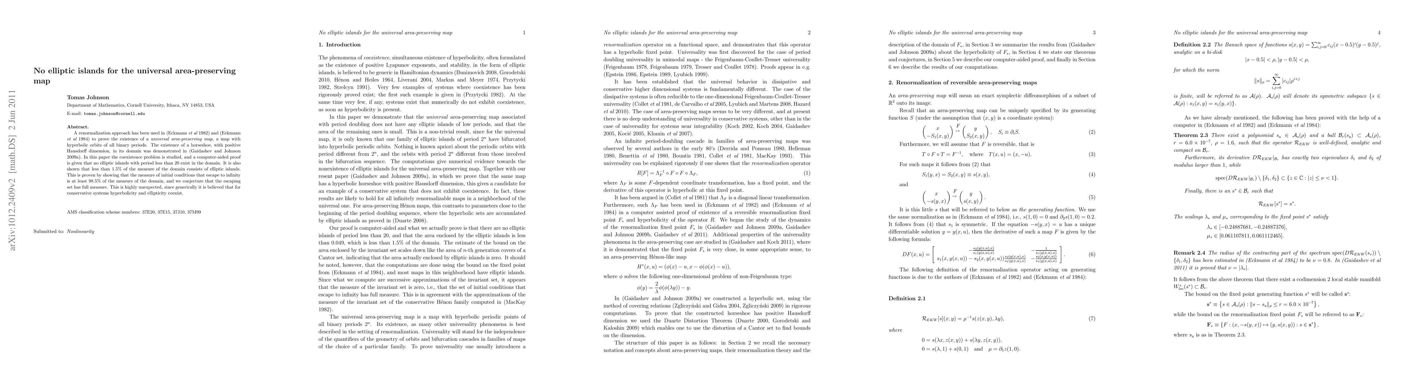 A renormalization approach has been used in \cite{EKW1} and \cite{EKW2} to prove the existence of a \textit{universal area-preserving map}, a map with hyperbolic orbits of all binary periods. The existence of a horseshoe, with positive Hausdorff dimension, in its domain was demonstrated in \cite{GJ1}. In this paper the coexistence problem is studied, and a computer-aided proof is given that no elliptic islands with period less than 20 exist in the domain. It is also shown that less than 1.5% of the measure of the domain consists of elliptic islands. This is proven by showing that the measure of initial conditions that escape to infinity is at least 98.5% of the measure of the domain, and we conjecture that the escaping set has full measure. This is highly unexpected, since generically it is believed that for conservative systems hyperbolicity and ellipticity coexist.
