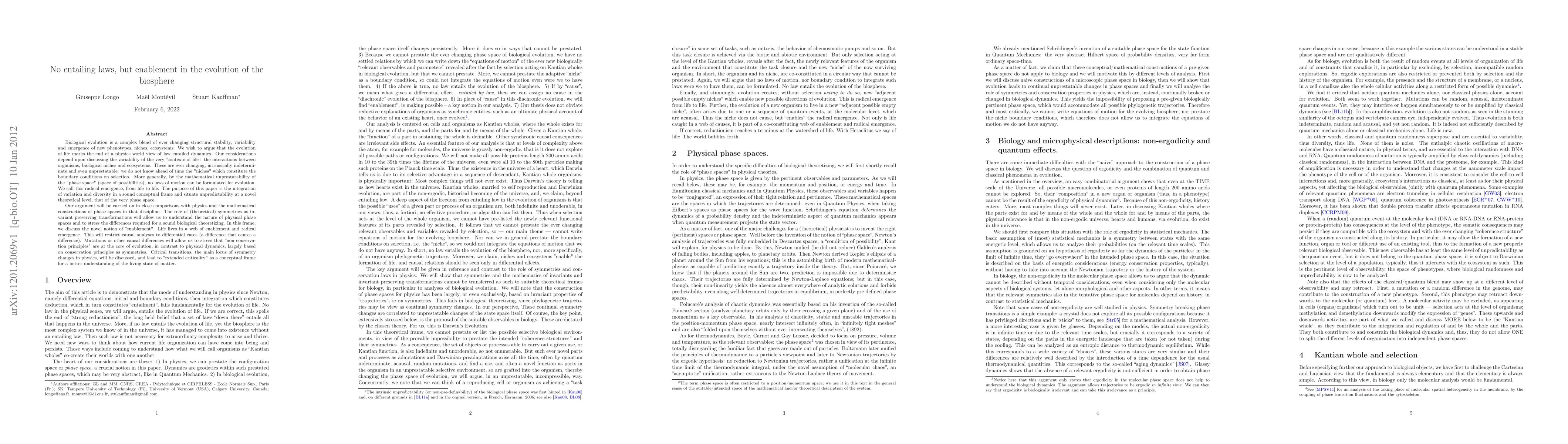 Biological evolution is a complex blend of ever changing structural stability, variability and emergence of new phenotypes, niches, ecosystems. We wish to argue that the evolution of life marks the end of a physics world view of law entailed dynamics. Our considerations depend upon discussing the variability of the very "contexts of life": the interactions between organisms, biological niches and ecosystems. These are ever changing, intrinsically indeterminate and even unprestatable: we do not know ahead of time the "niches" which constitute the boundary conditions on selection. More generally, by the mathematical unprestatability of the "phase space" (space of possibilities), no laws of motion can be formulated for evolution. We call this radical emergence, from life to life. The purpose of this paper is the integration of variation and diversity in a sound conceptual frame and situate unpredictability at a novel theoretical level, that of the very phase space. Our argument will be carried on in close comparisons with physics and the mathematical constructions of phase spaces in that discipline. The role of (theoretical) symmetries as invariant preserving transformations will allow us to understand the nature of physical phase spaces and to stress the differences required for a sound biological theoretizing. In this frame, we discuss the novel notion of "enablement". This will restrict causal analyses to differential cases (a difference that causes a difference). Mutations or other causal differences will allow us to stress that "non conservation principles" are at the core of evolution, in contrast to physical dynamics, largely based on conservation principles as symmetries. Critical transitions, the main locus of symmetry changes in physics, will be discussed, and lead to "extended criticality" as a conceptual frame for a better understanding of the living state of matter.
