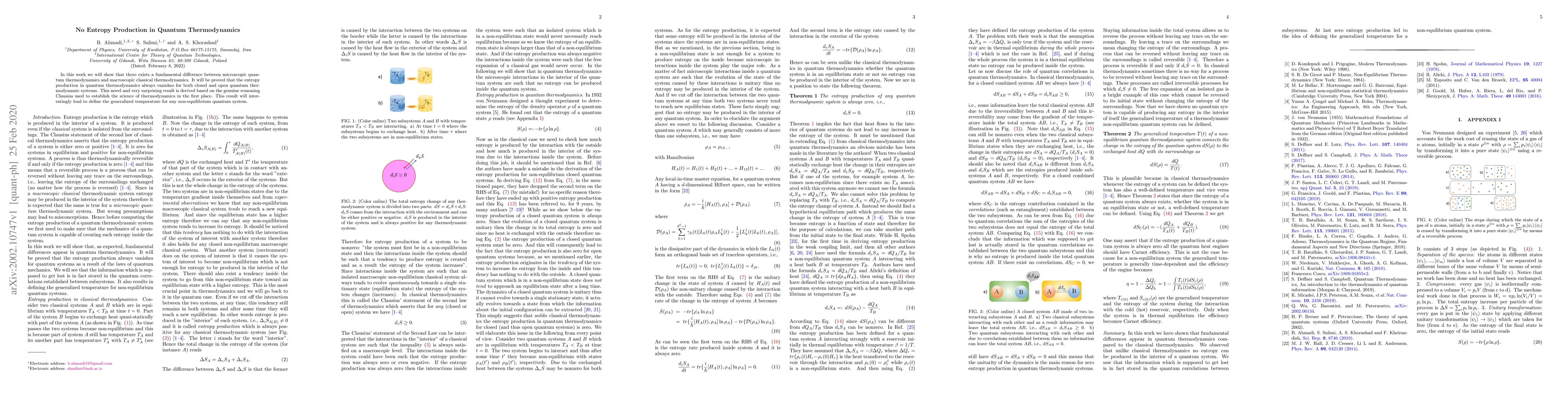 This paper demonstrates that entropy production vanishes in quantum thermodynamics for both closed and open systems, contrasting with classical thermodynamics. This novel finding redefines temperature for non-equilibrium quantum systems.