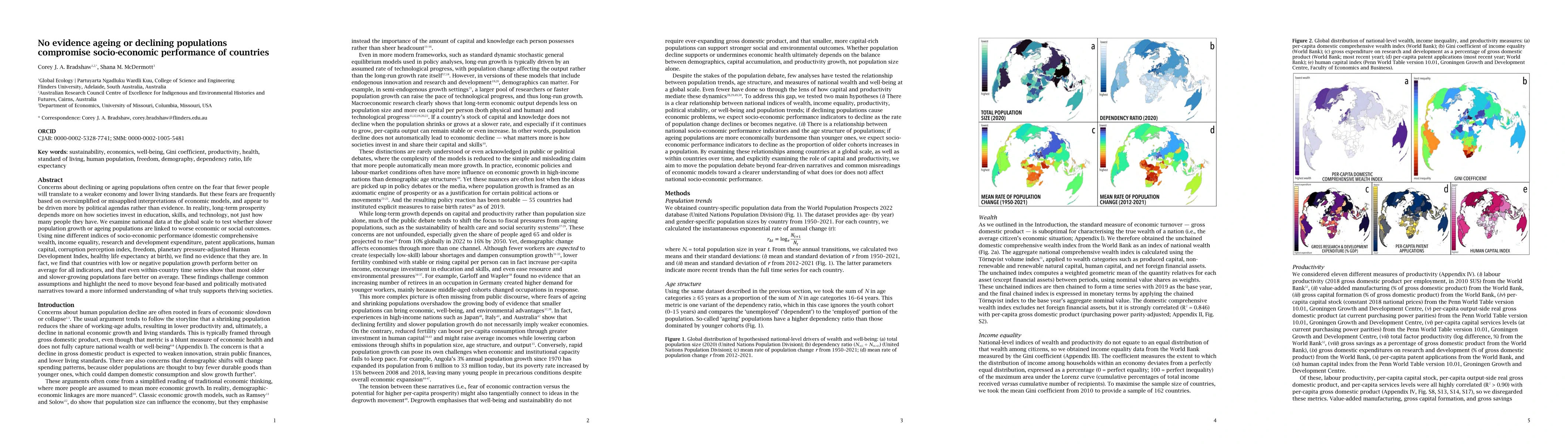 Concerns about declining or ageing populations often centre on the fear that fewer people will translate to a weaker economy and lower living standards. But these fears are frequently based on oversimplified or misapplied interpretations of economic models, and appear to be driven more by political agendas rather than evidence. In reality, long-term prosperity depends more on how societies invest in education, skills, and technology, not just how many people they have. We examine national data at the global scale to test whether slower population growth or ageing populations are linked to worse economic or social outcomes. Using nine different indices of socio-economic performance (domestic comprehensive wealth, income equality, research and development expenditure, patent applications, human capital, corruption perception index, freedom, planetary pressure-adjusted Human Development Index, healthy life expectancy at birth), we find no evidence that they are. In fact, we find that countries with low or negative population growth perform better on average for all indicators, and that even within-country time series show that most older and slower-growing populations fare better on average. These findings challenge common assumptions and highlight the need to move beyond fear-based and politically motivated narratives toward a more informed understanding of what truly supports thriving societies.