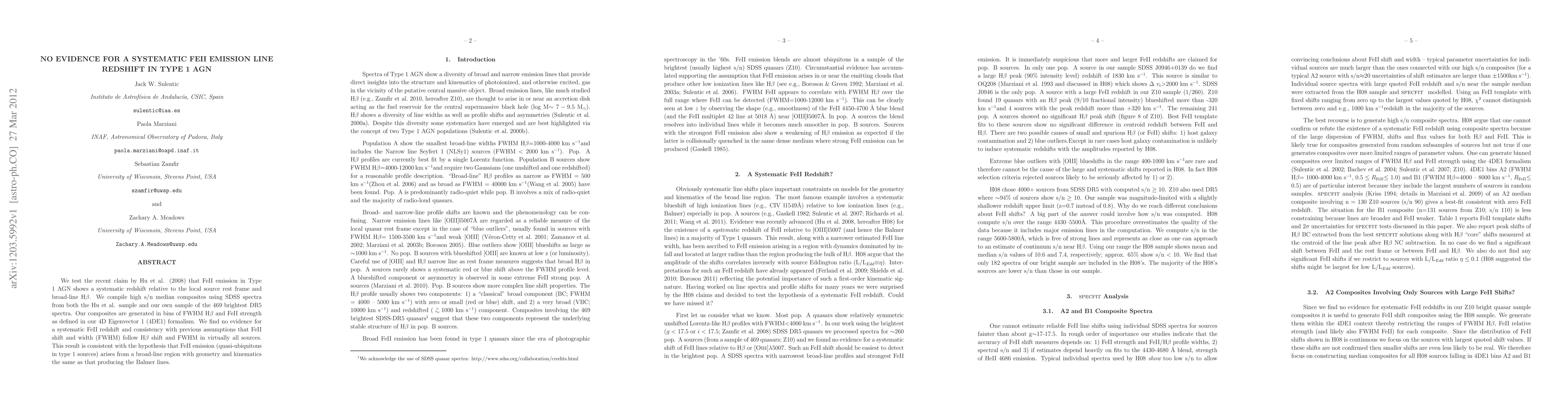 We test the recent claim by Hu et al. (2008) that FeII emission in Type 1 AGN shows a systematic redshift relative to the local source rest frame and broad-line Hbeta. We compile high s/n median composites using SDSS spectra from both the Hu et al. sample and our own sample of the 469 brightest DR5 spectra. Our composites are generated in bins of FWHM Hbeta and FeII strength as defined in our 4D Eigenvector 1 (4DE1) formalism. We find no evidence for a systematic FeII redshift and consistency with previous assumptions that FeII shift and width (FWHM) follow Hbeta shift and FWHM in virtually all sources. This result is consistent with the hypothesis that FeII emission (quasi-ubiquitous in type 1 sources) arises from a broad-line region with geometry and kinematics the same as that producing the Balmer lines.