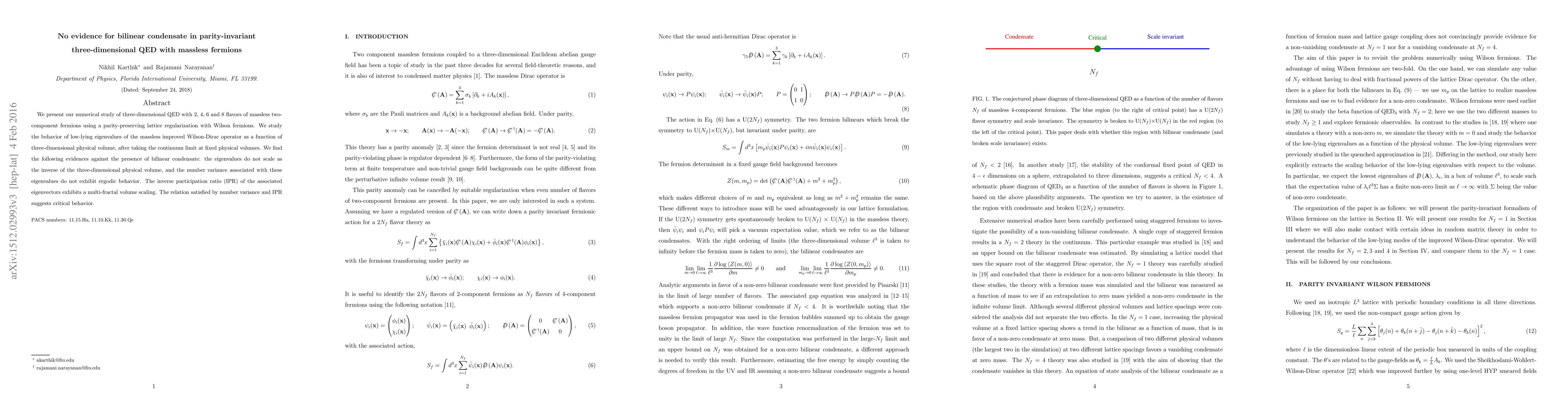 This study investigates three-dimensional QED with massless fermions using numerical simulations and finds no evidence for a bilinear condensate. The analysis of low-lying eigenvalues and their scaling behavior indicates critical behavior rather than the presence of a bilinear condensate.