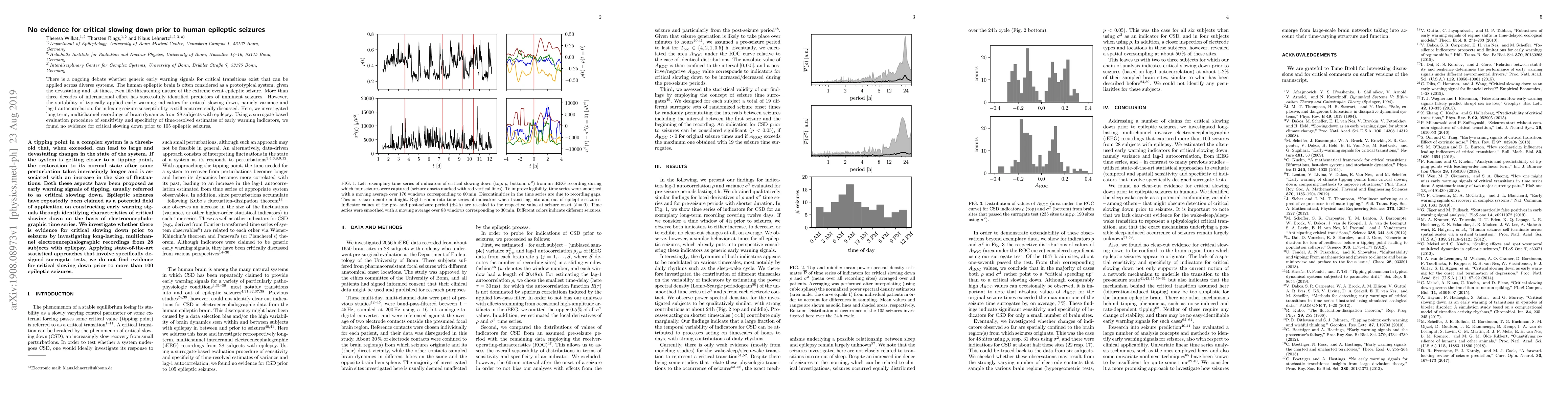 This study analyzed long-term brain recordings from 28 epilepsy patients and found no evidence of critical slowing down, as indicated by variance and lag-1 autocorrelation, prior to 105 epileptic seizures, challenging the applicability of these early warning signals in this context.