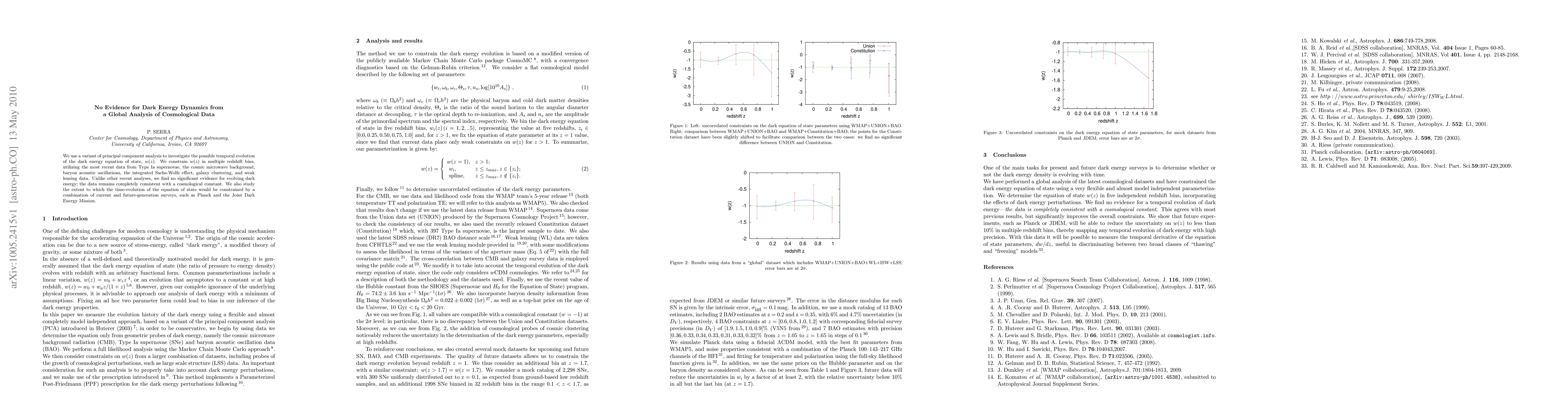 We use a variant of principal component analysis to investigate the possible temporal evolution of the dark energy equation of state, $w(z)$. We constrain $w(z)$ in multiple redshift bins, utilizing the most recent data from Type Ia supernovae, the cosmic microwave background, baryon acoustic oscillations, the integrated Sachs-Wolfe effect, galaxy clustering, and weak lensing data. Unlike other recent analyses, we find no significant evidence for evolving dark energy; the data remains completely consistent with a cosmological constant. We also study the extent to which the time-evolution of the equation of state would be constrained by a combination of current and future-generation surveys, such as Planck and the Joint Dark Energy Mission.