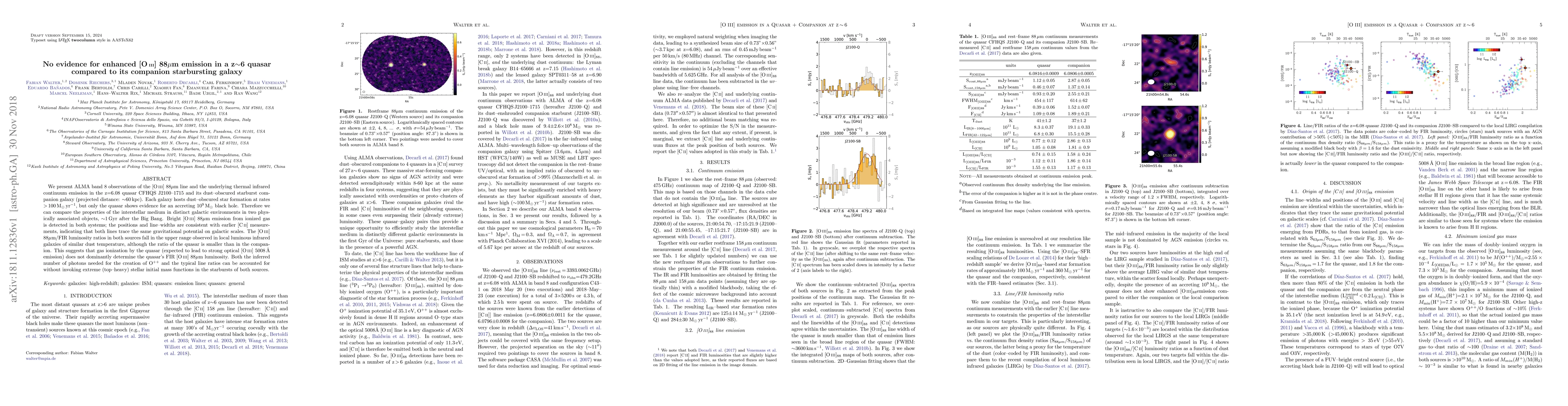 This study using ALMA observes [OIII] 88um emission in a z~6 quasar and its companion starburst galaxy, finding no enhanced [OIII] emission from the quasar compared to the galaxy. The results suggest that the quasar's gas ionization does not significantly affect the FIR [OIII] luminosity, and typical stellar initial mass functions can explain the observed line ratios.