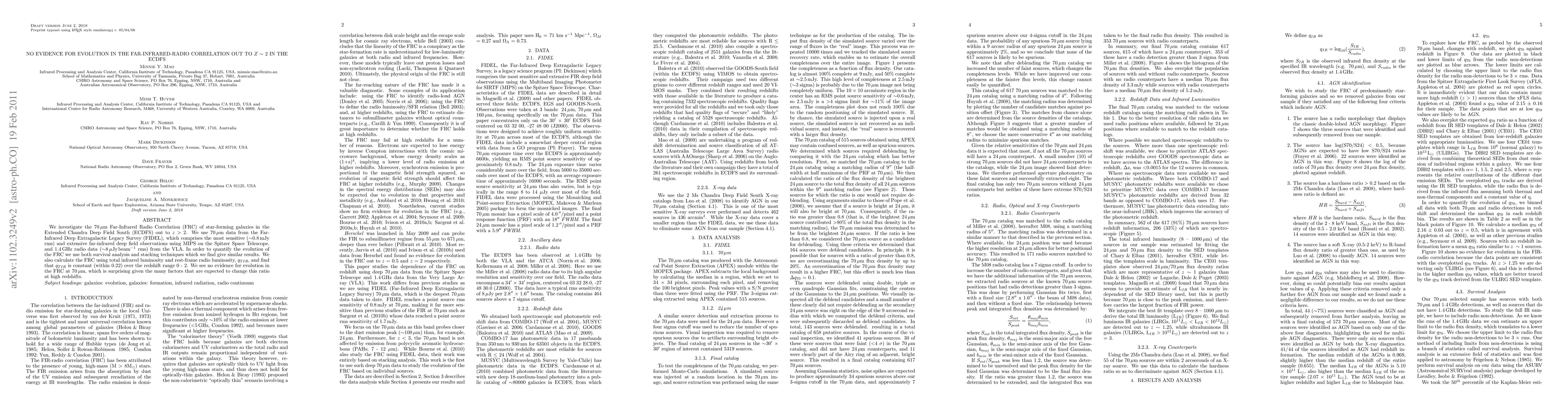 We investigate the 70 um Far-Infrared Radio Correlation (FRC) of star-forming galaxies in the Extended Chandra Deep Field South (ECDFS) out to z > 2. We use 70 um data from the Far-Infrared Deep Extragalactic Legacy Survey (FIDEL), which comprises the most sensitive (~0.8 mJy rms) and extensive far-infrared deep field observations using MIPS on the Spitzer Space Telescope, and 1.4 GHz radio data (~8 uJy/beam rms) from the VLA. In order to quantify the evolution of the FRC we use both survival analysis and stacking techniques which we find give similar results. We also calculate the FRC using total infrared luminosity and rest-frame radio luminosity, qTIR, and find that qTIR is constant (within 0.22) over the redshift range 0 - 2. We see no evidence for evolution in the FRC at 70 um which is surprising given the many factors that are expected to change this ratio at high redshifts.