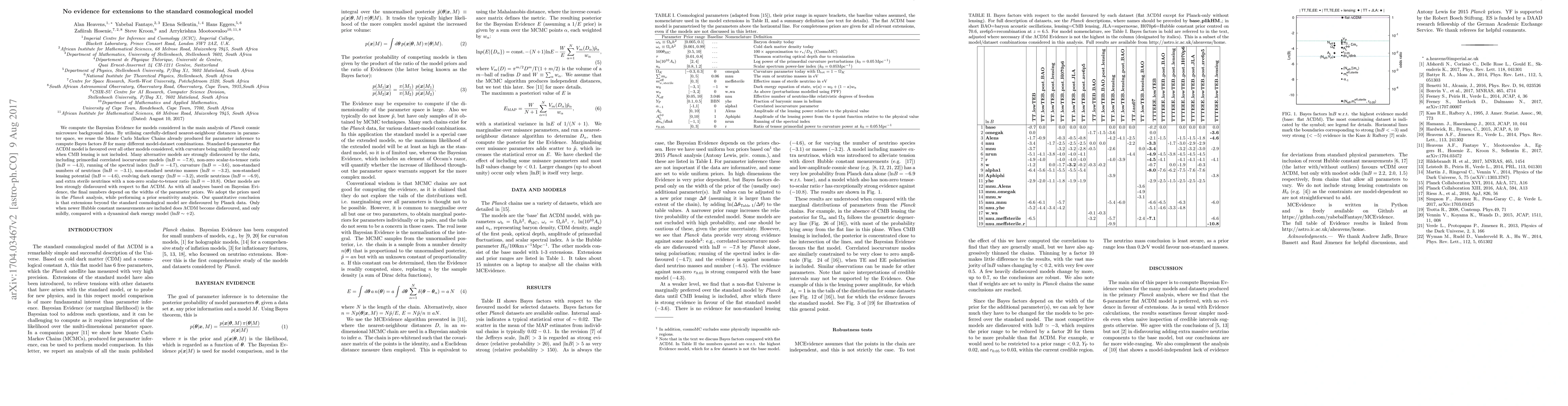 We compute the Bayesian Evidence for models considered in the main analysis of Planck cosmic microwave background data. By utilising carefully-defined nearest-neighbour distances in parameter space, we reuse the Monte Carlo Markov Chains already produced for parameter inference to compute Bayes factors $B$ for many different model-dataset combinations. Standard 6-parameter flat $\Lambda$CDM model is favoured over all other models considered, with curvature being mildly favoured only when CMB lensing is not included. Many alternative models are strongly disfavoured by the data, including primordial correlated isocurvature models ($\ln B=-7.8$), non-zero scalar-to-tensor ratio ($\ln B=-4.3$), running of the spectral index ($\ln B = -4.7$), curvature ($\ln B=-3.6$), non-standard numbers of neutrinos ($\ln B=-3.1$), non-standard neutrino masses ($\ln B=-3.2$), non-standard lensing potential ($\ln B=-4.6$), evolving dark energy ($\ln B=-3.2$), sterile neutrinos ($\ln B=-6.9$), and extra sterile neutrinos with a non-zero scalar-to-tensor ratio ($\ln B=-10.8$). Other models are less strongly disfavoured with respect to flat $\Lambda$CDM. As with all analyses based on Bayesian Evidence, the final numbers depend on the widths of the parameter priors. We adopt the priors used in the Planck analysis, while performing a prior sensitivity analysis. Our quantitative conclusion is that extensions beyond the standard cosmological model are disfavoured by Planck data. Only when newer Hubble constant measurements are included does $\Lambda$CDM become disfavoured, and only mildly, compared with a dynamical dark energy model ($\ln B\sim +2$).