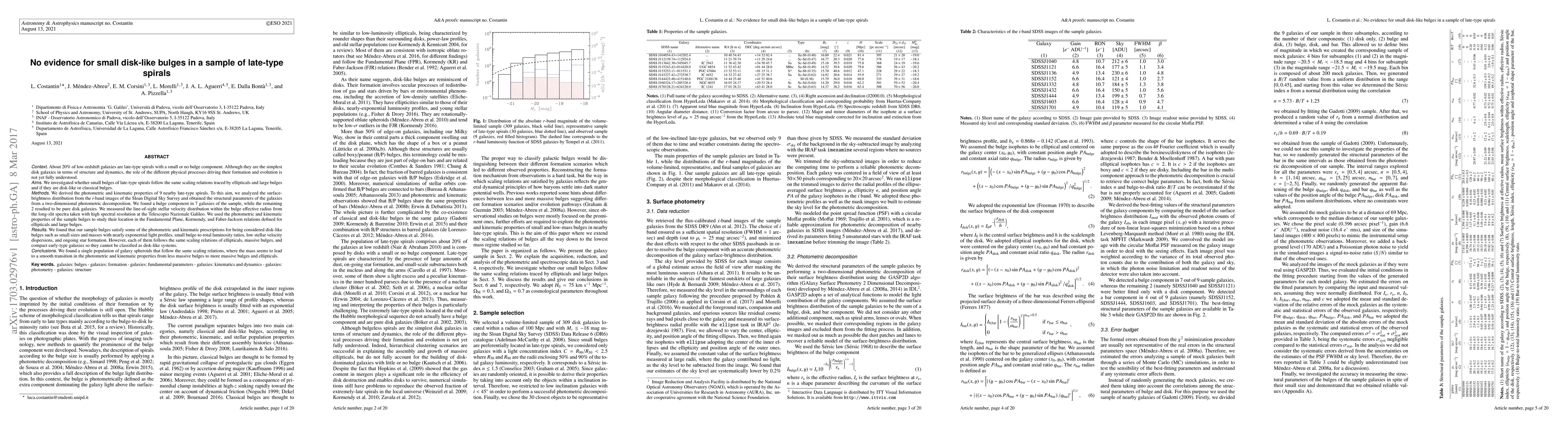 About 20% of low-redshift galaxies are late-type spirals with a small or no bulge component. Although they are the simplest disk galaxies in terms of structure and dynamics, the role of the different physical processes driving their formation and evolution is not yet fully understood. We investigated whether small bulges of late-type spirals follow the same scaling relations traced by ellipticals and large bulges and if they are disk-like or classical bulges. We derived the photometric and kinematic properties of 9 nearby late-type spirals. To this aim, we analyzed the surface brightness distribution from the i-band images of the Sloan Digital Sky Survey and obtained the structural parameters of the galaxies from a two-dimensional photometric decomposition. We measured the line-of-sight stellar velocity distribution within the bulge effective radius from the long-slit spectra taken with high spectral resolution at the Telescopio Nazionale Galileo. We used the photometric and kinematic properties of the sample bulges to study their location in the Fundamental Plane, Kormendy, and Faber-Jackson relations defined for ellipticals and large bulges. We found that our sample bulges satisfy some of the photometric and kinematic prescriptions for being considered disk-like bulges such as small sizes and masses with nearly exponential light profiles, small bulge-to-total luminosity ratios, low stellar velocity dispersions, and ongoing star formation. However, each of them follows the same scaling relations of ellipticals, massive bulges, and compact early-type galaxies so they cannot be classified as disk-like systems. We find a single population of galaxy spheroids that follow the same scaling relations, where the mass seems to lead to a smooth transition in the photometric and kinematic properties from less massive bulges to more massive bulges and ellipticals.