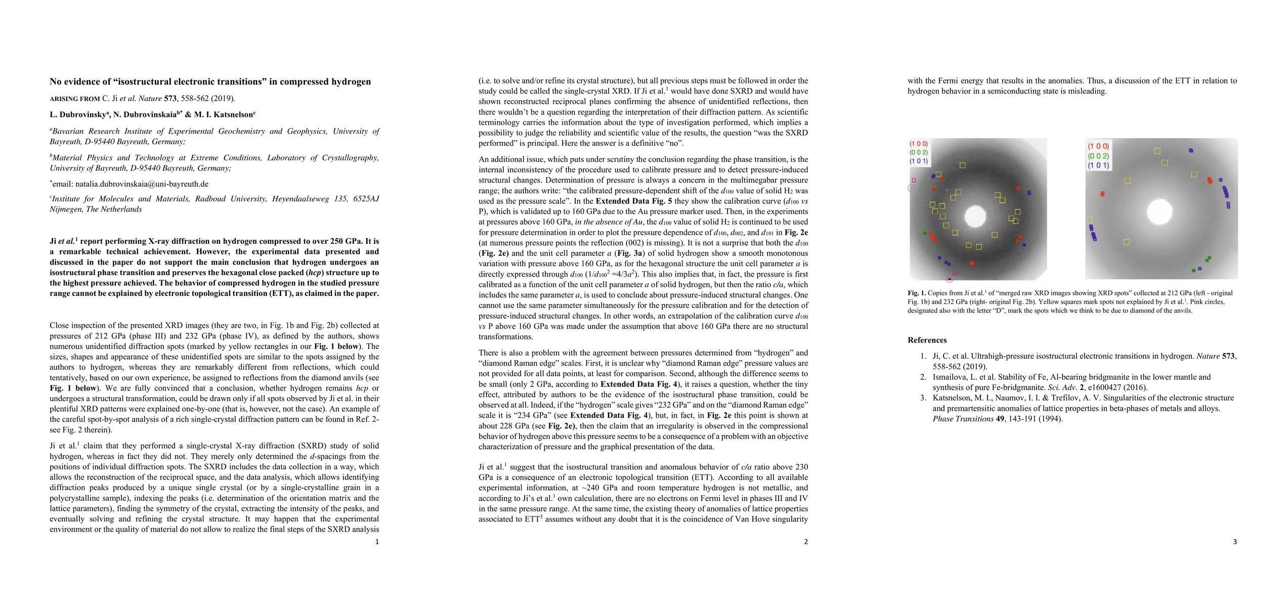 Ji et al. conducted X-ray diffraction on hydrogen compressed to over 250 GPa, but their data do not support the claim of an isostructural phase transition preserving the hcp structure. The study does not validate the proposed electronic topological transition (ETT).