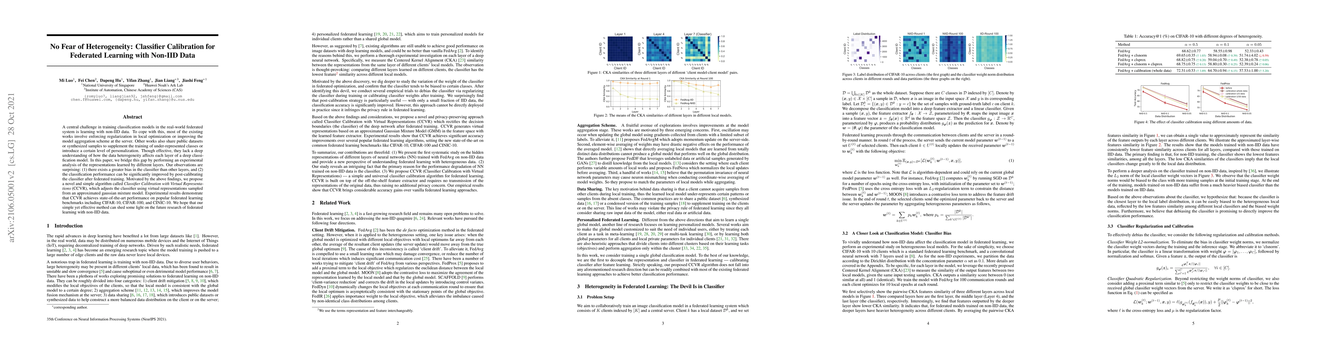 A central challenge in training classification models in the real-world federated system is learning with non-IID data. To cope with this, most of the existing works involve enforcing regularization in local optimization or improving the model aggregation scheme at the server. Other works also share public datasets or synthesized samples to supplement the training of under-represented classes or introduce a certain level of personalization. Though effective, they lack a deep understanding of how the data heterogeneity affects each layer of a deep classification model. In this paper, we bridge this gap by performing an experimental analysis of the representations learned by different layers. Our observations are surprising: (1) there exists a greater bias in the classifier than other layers, and (2) the classification performance can be significantly improved by post-calibrating the classifier after federated training. Motivated by the above findings, we propose a novel and simple algorithm called Classifier Calibration with Virtual Representations (CCVR), which adjusts the classifier using virtual representations sampled from an approximated gaussian mixture model. Experimental results demonstrate that CCVR achieves state-of-the-art performance on popular federated learning benchmarks including CIFAR-10, CIFAR-100, and CINIC-10. We hope that our simple yet effective method can shed some light on the future research of federated learning with non-IID data.