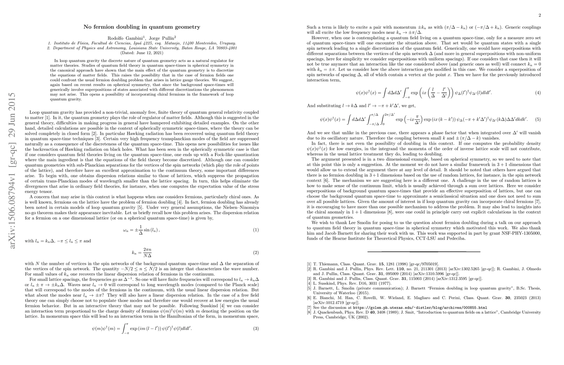 In loop quantum gravity, the natural discretization of quantum geometry potentially resolves the fermion doubling problem, suggesting that chiral fermions can be incorporated in this framework without the usual lattice artifacts. This effect is due to superpositions of states with different discretizations in background space-times.