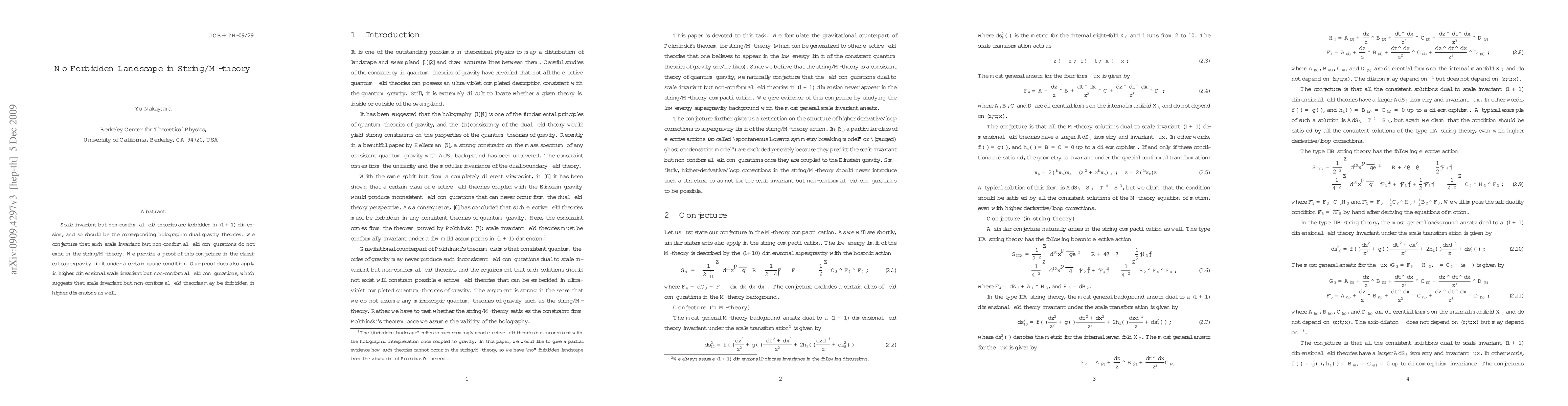 Scale invariant but non-conformal field theories are forbidden in (1+1) dimension, and so should be the corresponding holographic dual gravity theories. We conjecture that such scale invariant but non-conformal field configurations do not exist in the string/M-theory. We provide a proof of this conjecture in the classical supergravity limit under a certain gauge condition. Our proof does also apply in higher dimensional scale invariant but non-conformal field configurations, which suggests that scale invariant but non-conformal field theories may be forbidden in higher dimensions as well.