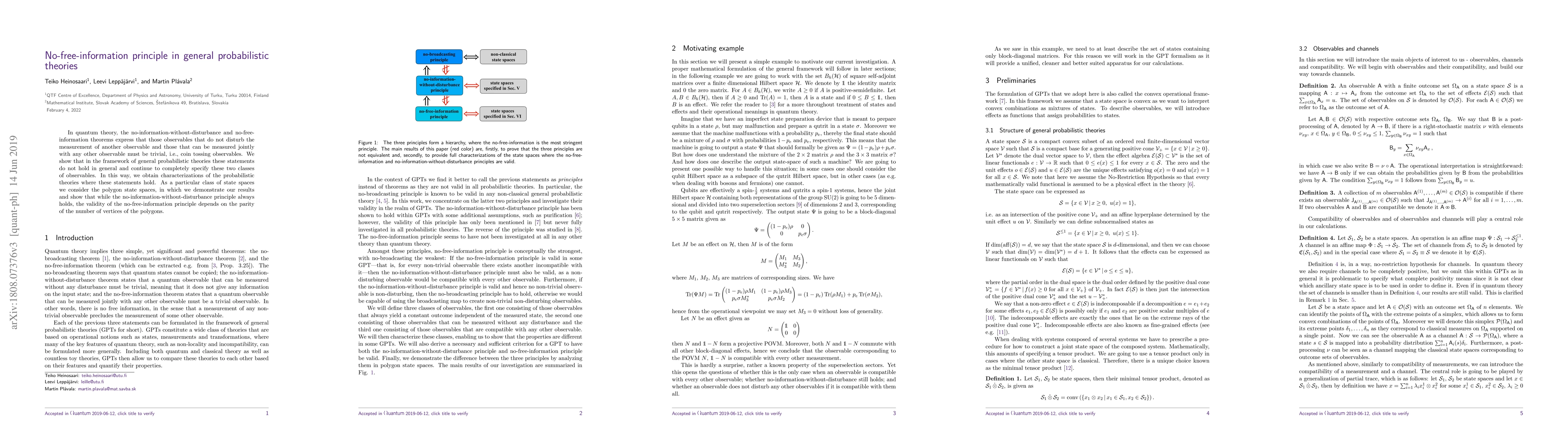 The paper explores the no-information-without-disturbance and no-free-information principles in general probabilistic theories, finding they do not universally apply and characterizes scenarios where they hold. Specifically, for polygon state spaces, the no-information-without-disturbance principle always holds, but the no-free-information principle's validity depends on the polygon's vertex count parity.