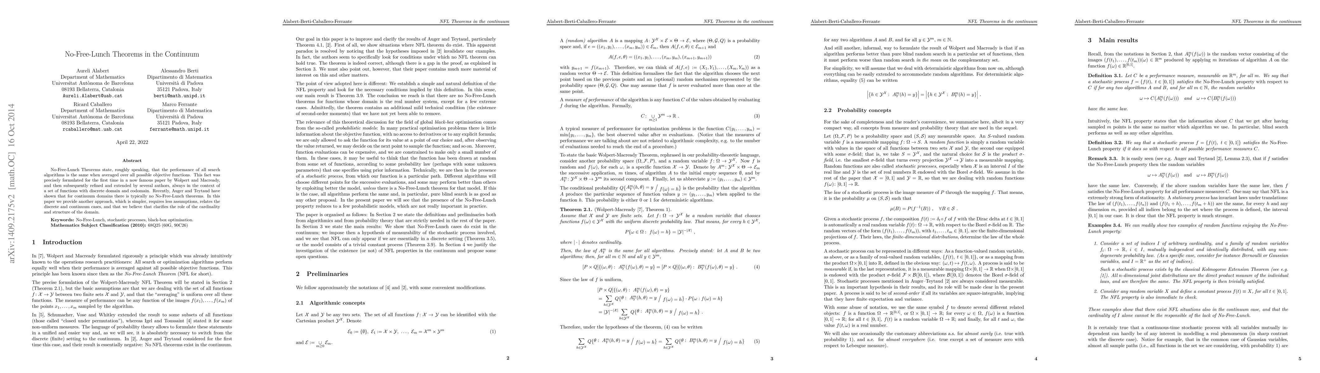 No-Free-Lunch Theorems state, roughly speaking, that the performance of all search algorithms is the same when averaged over all possible objective functions. This fact was precisely formulated for the first time in a now famous paper by Wolpert and Macready, and then subsequently refined and extended by several authors, always in the context of a set of functions with discrete domain and codomain. Recently, Auger and Teytaud have shown that for continuum domains there is typically no No-Free-Lunch theorems. In this paper we provide another approach, which is simpler, requires less assumptions, relates the discrete and continuum cases, and that we believe that clarifies the role of the cardinality and structure of the domain.
