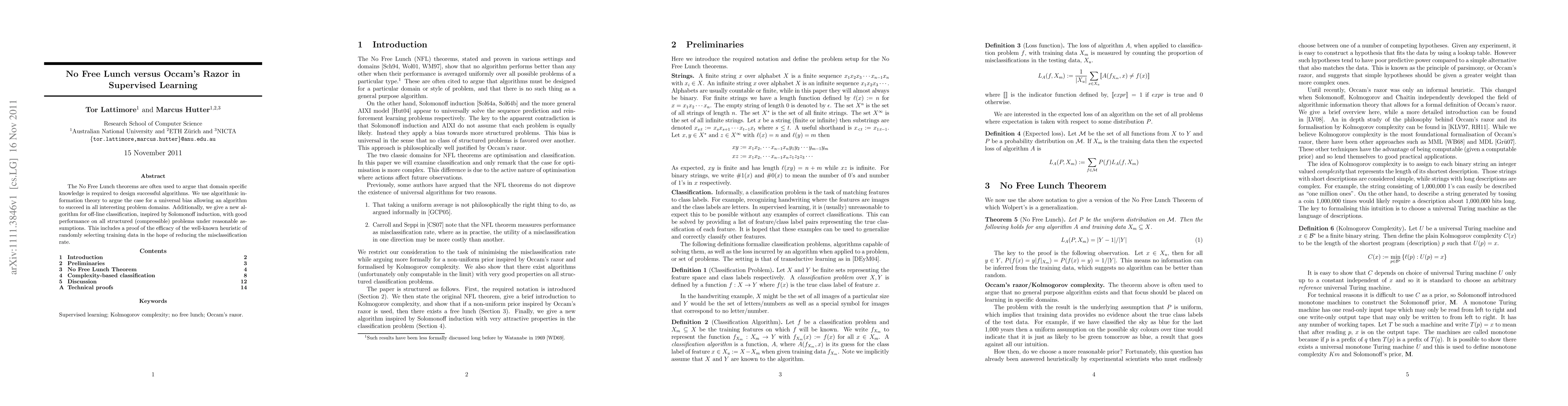 The No Free Lunch theorems are often used to argue that domain specific knowledge is required to design successful algorithms. We use algorithmic information theory to argue the case for a universal bias allowing an algorithm to succeed in all interesting problem domains. Additionally, we give a new algorithm for off-line classification, inspired by Solomonoff induction, with good performance on all structured problems under reasonable assumptions. This includes a proof of the efficacy of the well-known heuristic of randomly selecting training data in the hope of reducing misclassification rates.