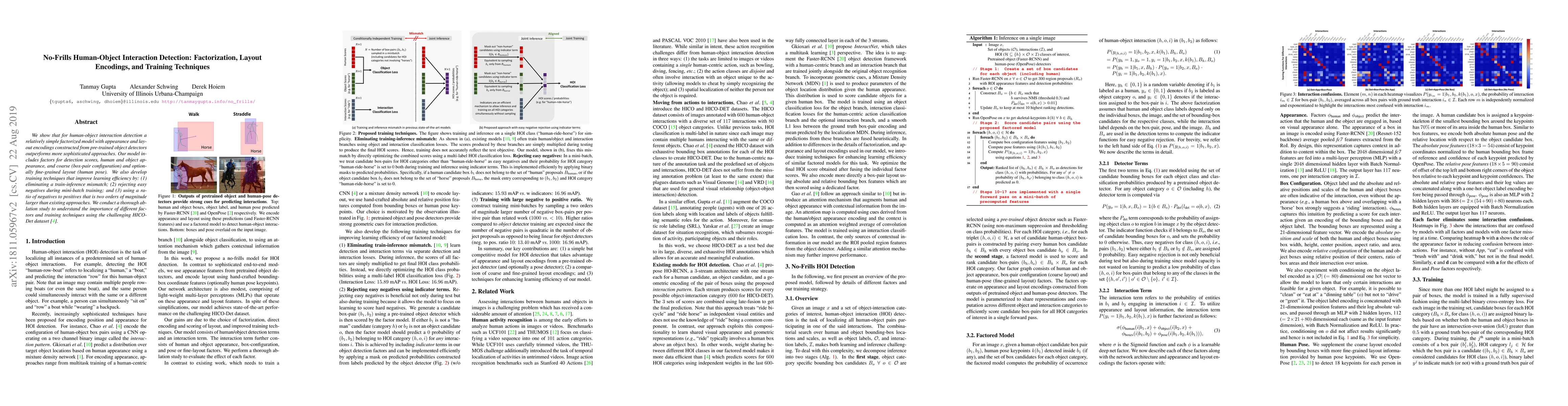This paper proposes a simple yet effective factorized model for human-object interaction detection, which leverages pre-trained object detectors and includes factors for detection scores, appearance, and layout encodings. The authors introduce training techniques to enhance learning efficiency and conduct an ablation study on the HICO-Det dataset to analyze the model's components.