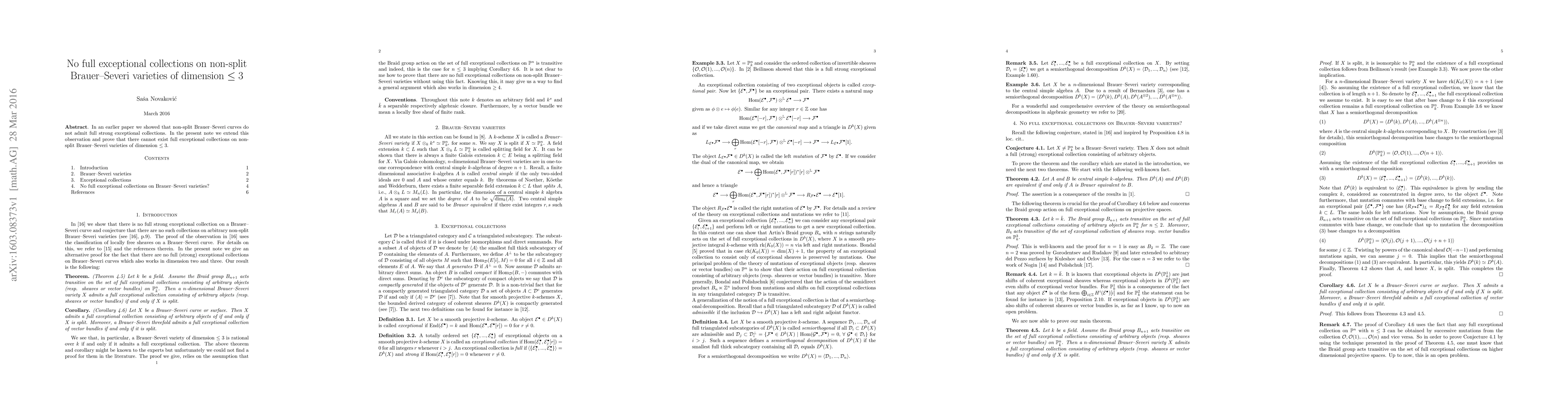 Summary: This paper extends previous findings by demonstrating that non-split Brauer-Severi varieties of dimension up to 3 do not support full exceptional collections, reinforcing the absence of such structures on these types of algebraic varieties.