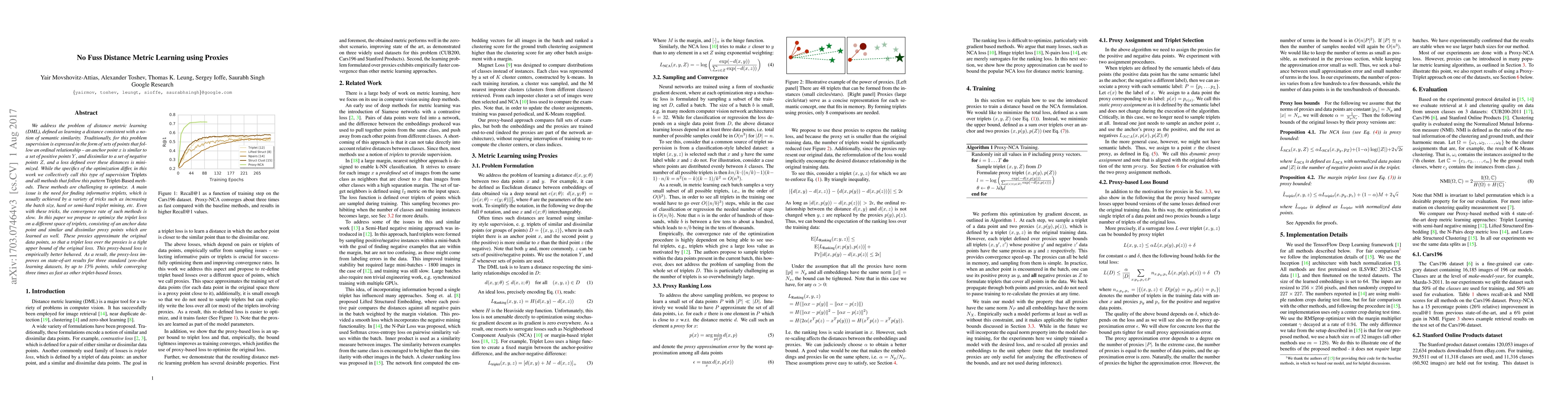 Researchers propose a new distance metric learning approach using proxies that learn to approximate original data points, achieving faster convergence and improved results on three zero-shot learning datasets.