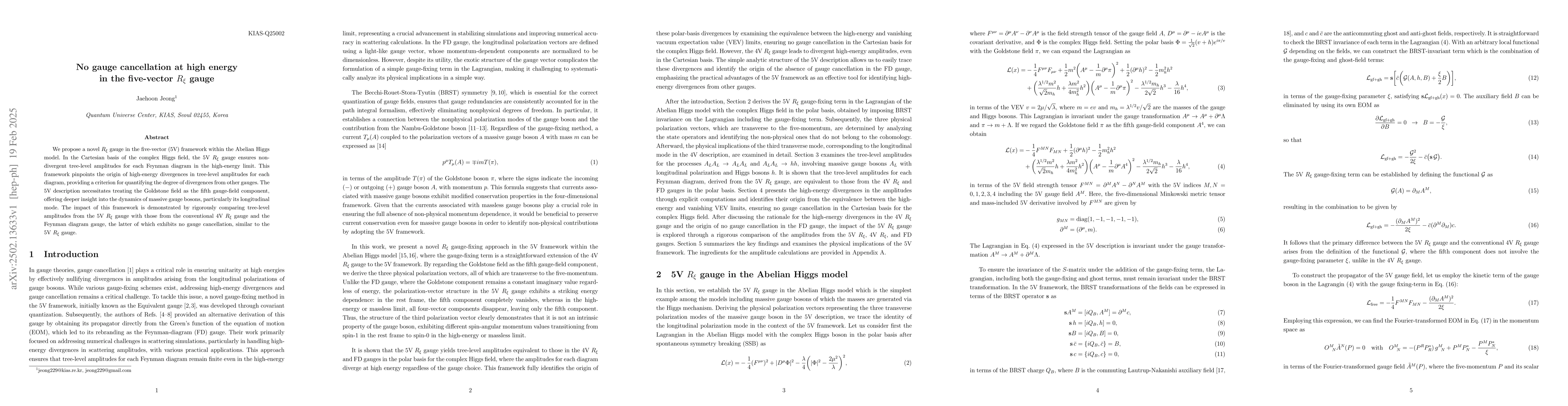 The paper introduces a novel $R_\xi$ gauge in the five-vector framework, ensuring non-divergent tree-level amplitudes in the high-energy limit, and identifies the origin of high-energy divergences in other gauges.