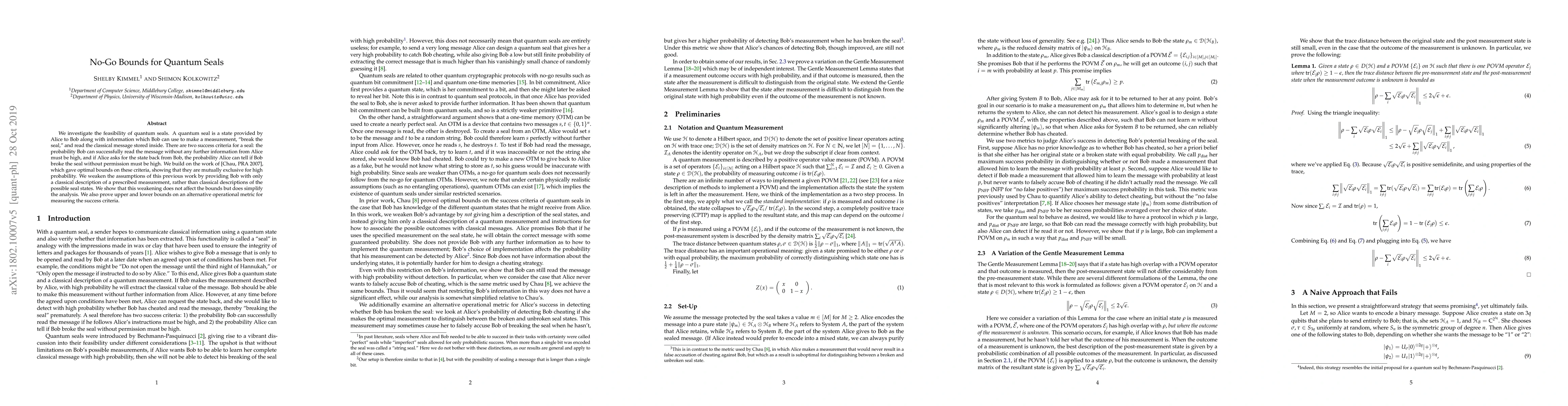 We investigate the feasibility of quantum seals. A quantum seal is a state provided by Alice to Bob along with information which Bob can use to make a measurement, "break the seal," and read the classical message stored inside. There are two success criteria for a seal: the probability Bob can successfully read the message without any further information from Alice must be high, and if Alice asks for the state back from Bob, the probability Alice can tell if Bob broke the seal without permission must be high. We build on the work of [Chau, PRA 2007], which gave optimal bounds on these criteria, showing that they are mutually exclusive for high probability. We weaken the assumptions of this previous work by providing Bob with only a classical description of a prescribed measurement, rather than classical descriptions of the possible seal states. We show that this weakening does not affect the bounds but does simplify the analysis. We also prove upper and lower bounds on an alternative operational metric for measuring the success criteria.