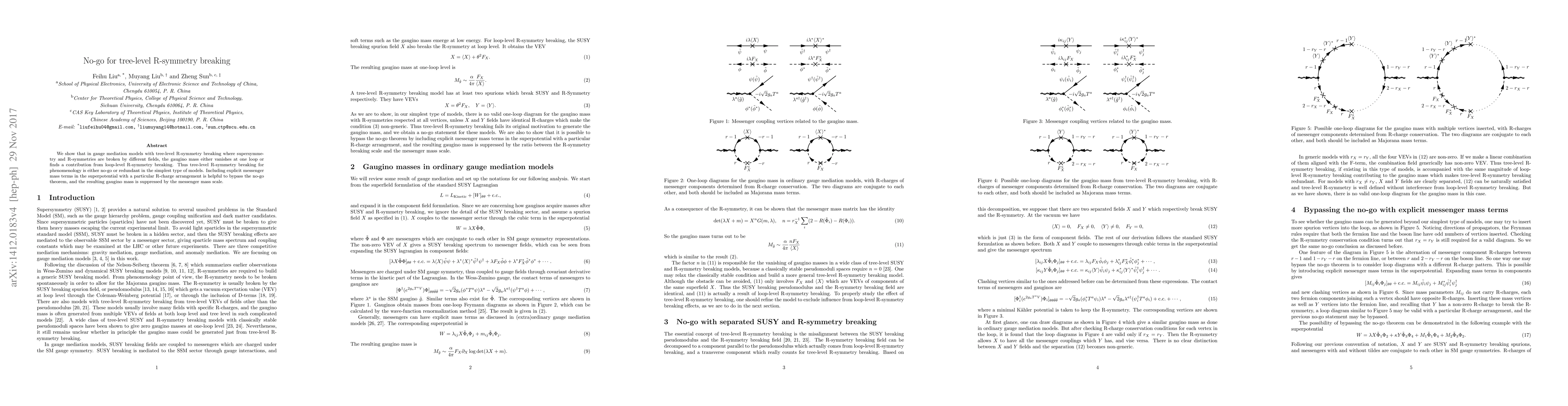 This paper demonstrates that in gauge mediation models with tree-level R-symmetry breaking, the gaugino mass either vanishes at one loop or requires loop-level R-symmetry breaking, rendering tree-level R-symmetry breaking either impossible or redundant. Including specific messenger mass terms in the superpotential can bypass this no-go theorem, albeit with suppressed gaugino masses.