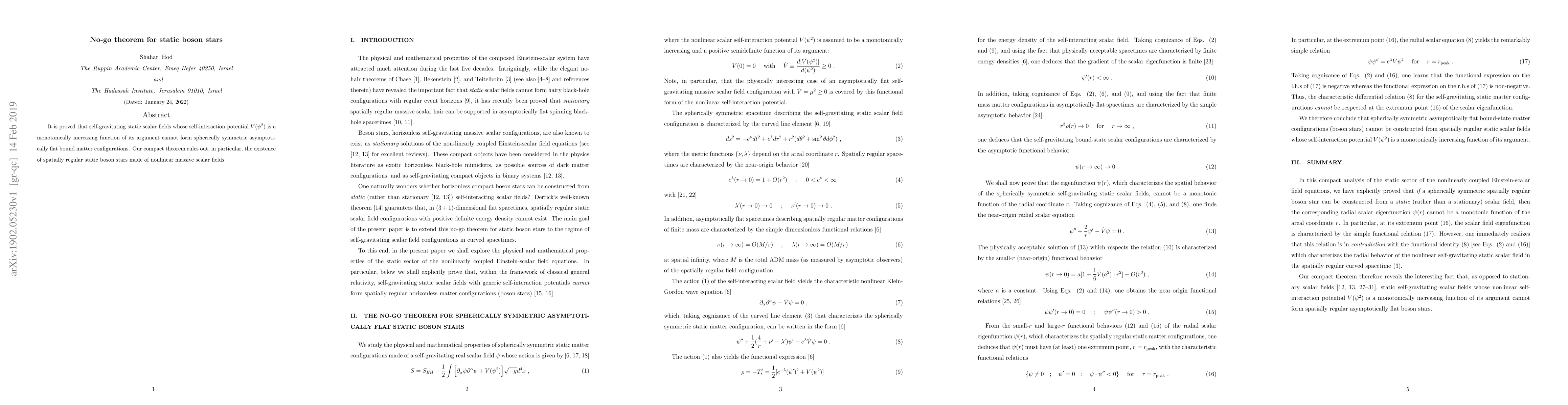 The paper proves a no-go theorem showing that static scalar fields with monotonically increasing self-interaction potentials cannot form spherically symmetric, asymptotically flat, bound matter configurations. This rules out the existence of static boson stars composed of nonlinear massive scalar fields.