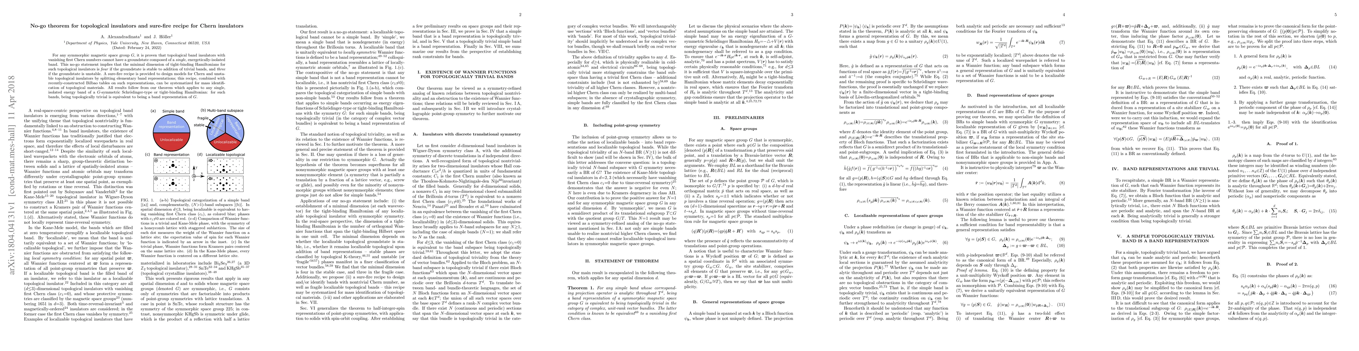 This paper proves a no-go theorem for topological insulators with vanishing first Chern numbers, showing they cannot have a single, isolated band, and provides a recipe for designing Chern insulators. The theorem applies to any $G$-symmetric Hamiltonian, and the recipe leverages Bilbao tables for systematic identification of topological materials.