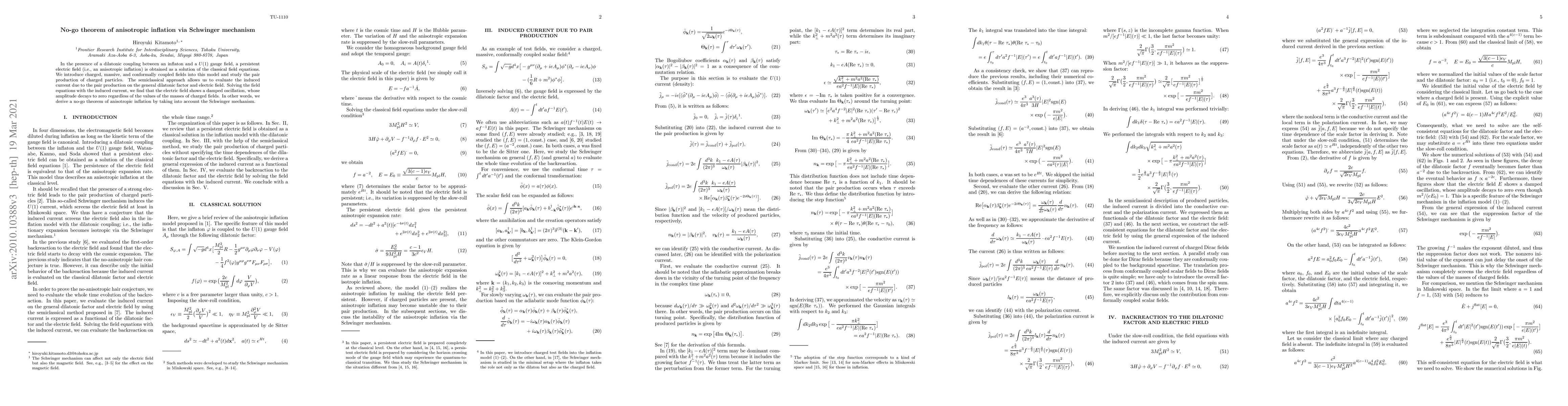 In the presence of a dilatonic coupling between an inflaton and a $U(1)$ gauge field, a persistent electric field (i.e., an anisotropic inflation) is obtained as a solution of the classical field equations. We introduce charged, massive, and conformally coupled fields into this model and study the pair production of charged particles. The semiclassical approach allows us to evaluate the induced current due to the pair production on the general dilatonic factor and electric field. Solving the field equations with the induced current, we find that the electric field shows a damped oscillation, whose amplitude decays to zero regardless of the values of the masses of charged fields. In other words, we derive a no-go theorem of anisotropic inflation by taking into account the Schwinger mechanism.